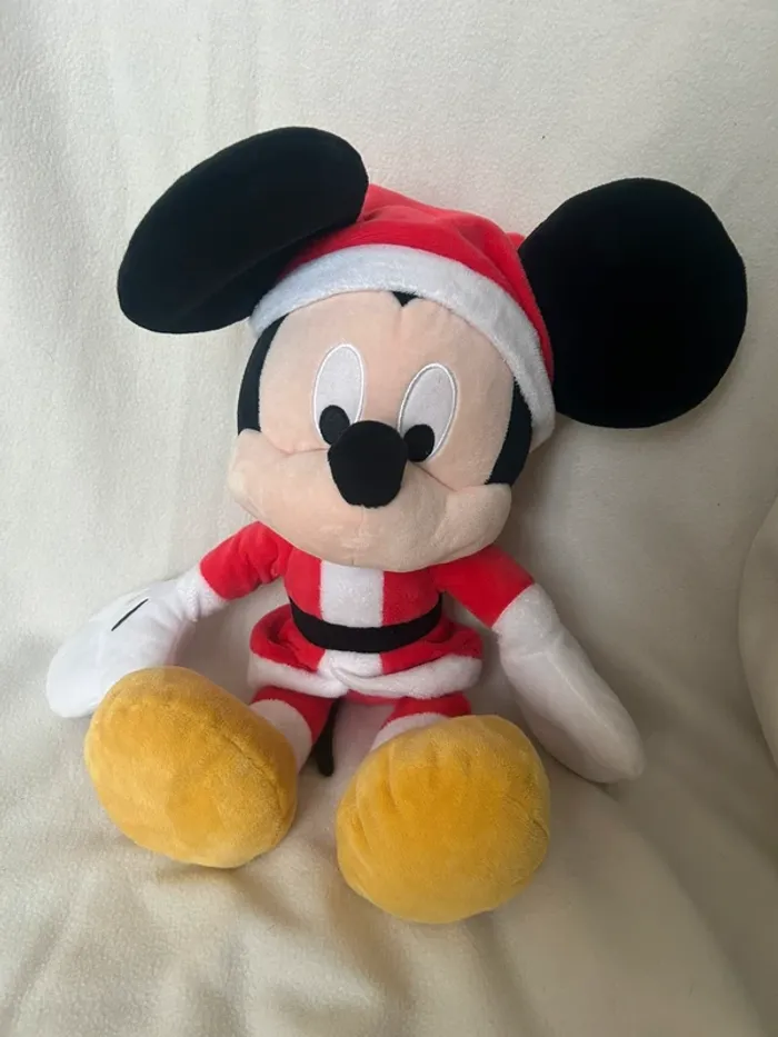Peluche Mickey Mouse habillé en Père Noël, marque Nicotoy sous licence Disney. Couleurs vives, douce au toucher, en très bon état général. Parfaite pour la décoration de Noël ou pour offrir à un fan de Mickey. Mesure 40CM Envoi rapide et soigné.