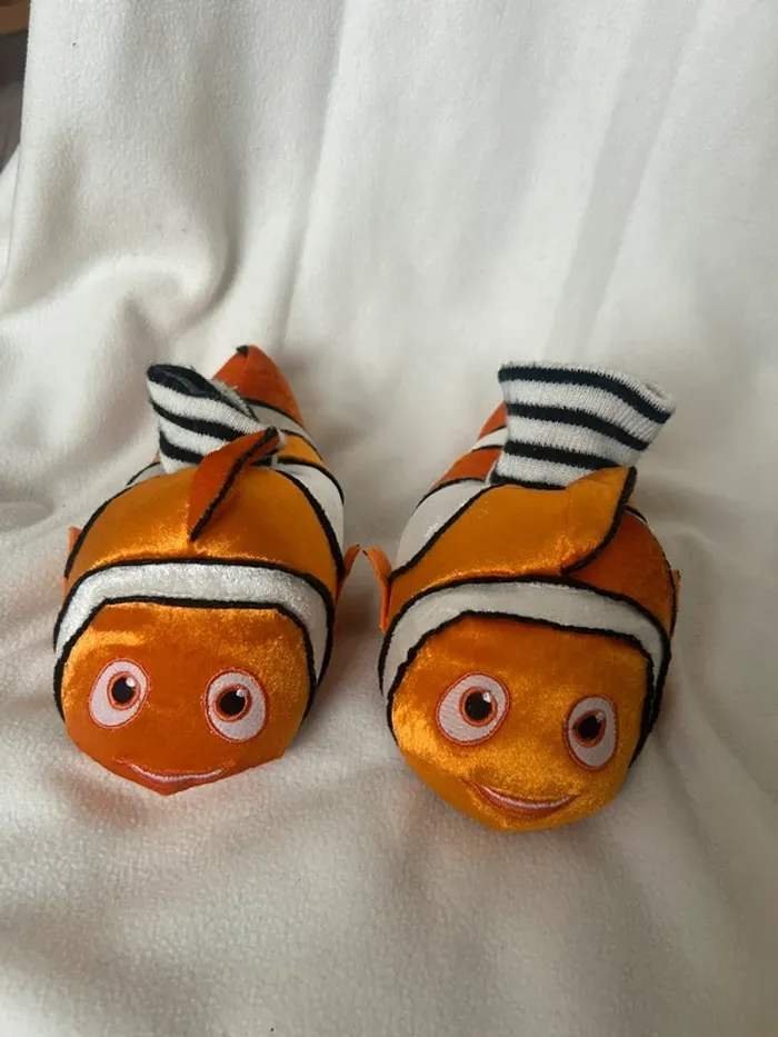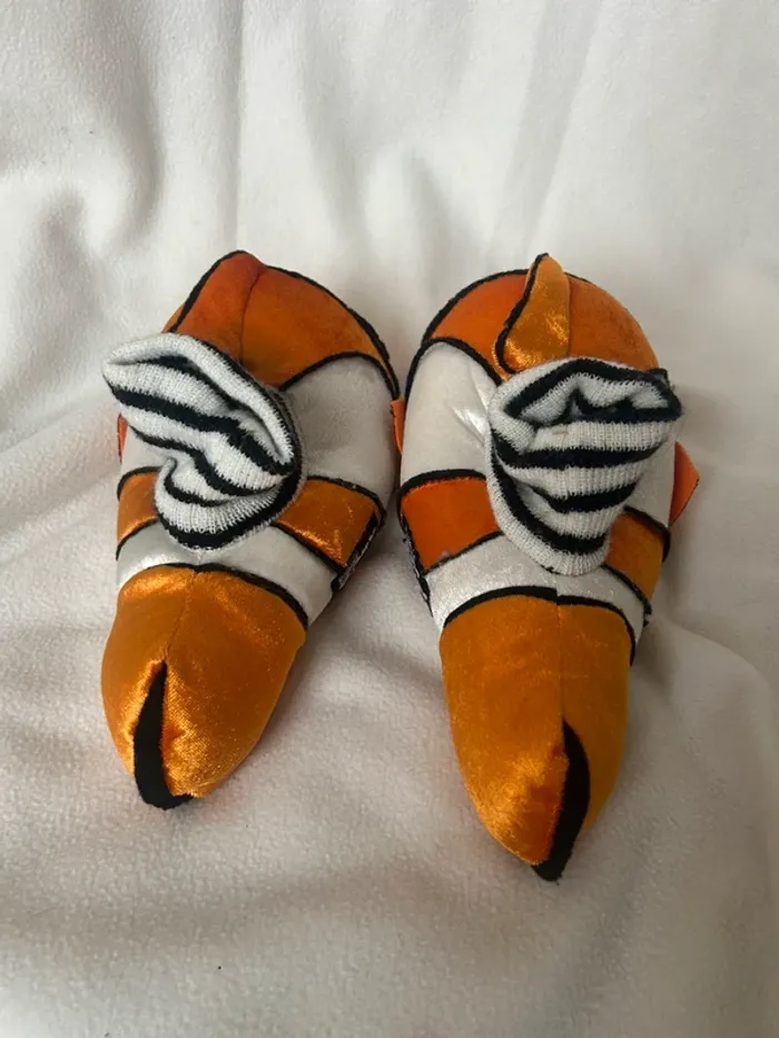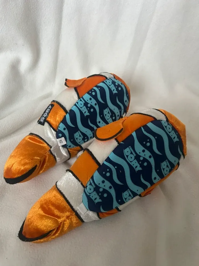 Adorables chaussons Nemo inspirés du film Le Monde de Dory (Disney Pixar). Pointure 24. Coloris orange et blanc avec nageoires et yeux brodés, semelles décorées du logo “Dory”. Chaussons doux, confortables et amusants, parfaits pour la maison. Très bon état général, peu portés.