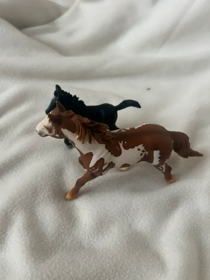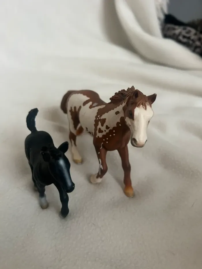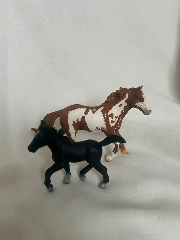 Lot de 2 figurines Schleich : • 1 cheval adulte marron et blanc type Appaloosa • 1 poulain noir Détails peints à la main, qualité Schleich, très réalistes. Bon état général, légères traces d’usage. Idéal pour collection, jeu ou univers équestre (ferme, centre équestre, etc.).