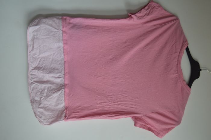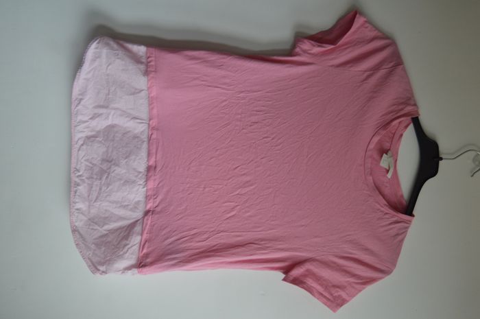 T-shirt femme H&M à la coupe droite avec manches courtes et encolure arrondie. Modèle bi-matière avec bas en tissu plus léger apportant un effet superposé discret. Matière douce et souple, tombé naturel, coloris rose uni facile à associer, style simple et féminin.