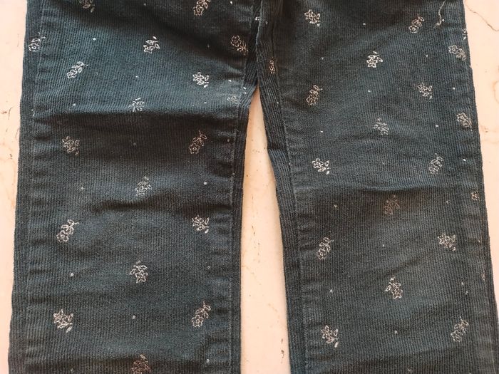 - un pantalon en velours côtelé vert foncé Sergent Major, porté mais encore en bon état général (quelques marques d'usure aux genoux).