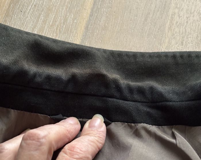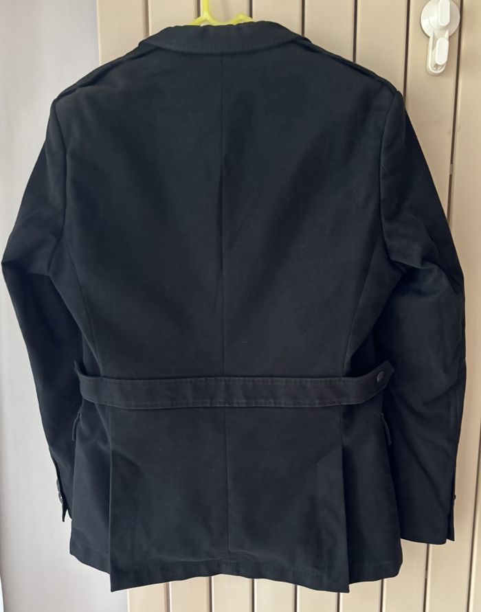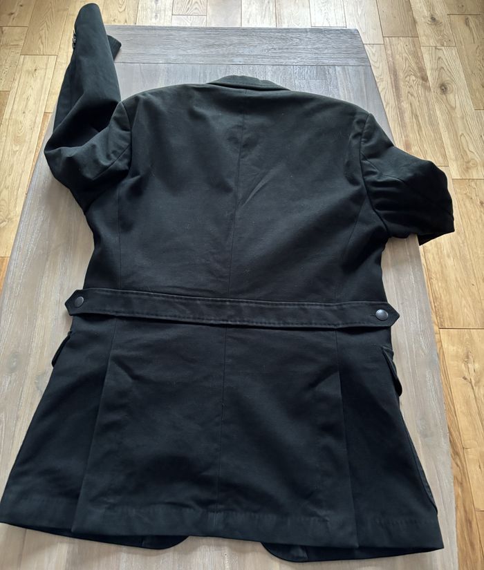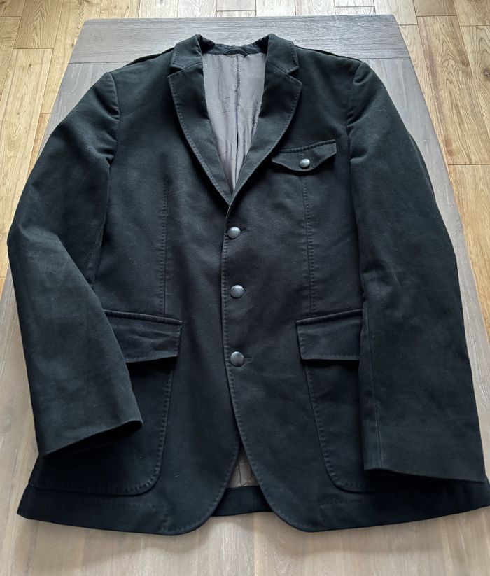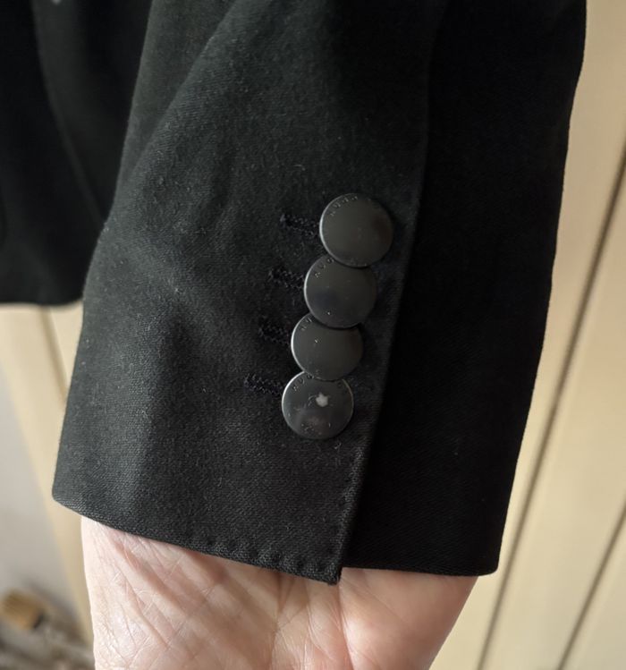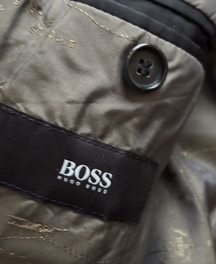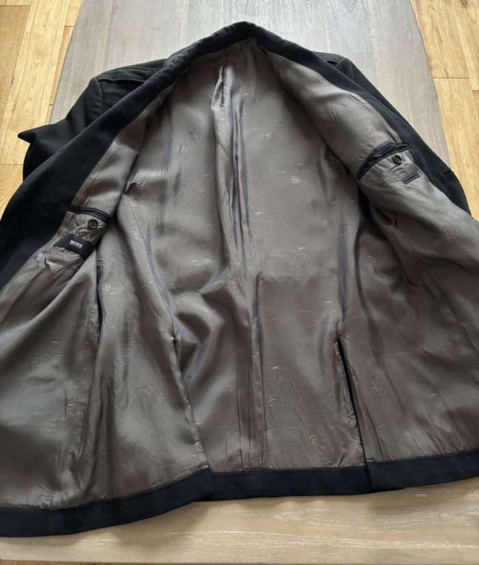 Veste Hugo Boss. Poches sur le devant et à l'intérieur. Entièrement doublée, très bonne tenue. Assez épaisse. Coloris noir. Très bon état, seul le col a un peu changé de couleur mais n'est pas usé du tout. Taille 50. Epaule à épaule 46 cm, hauteur 80 cm.