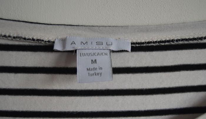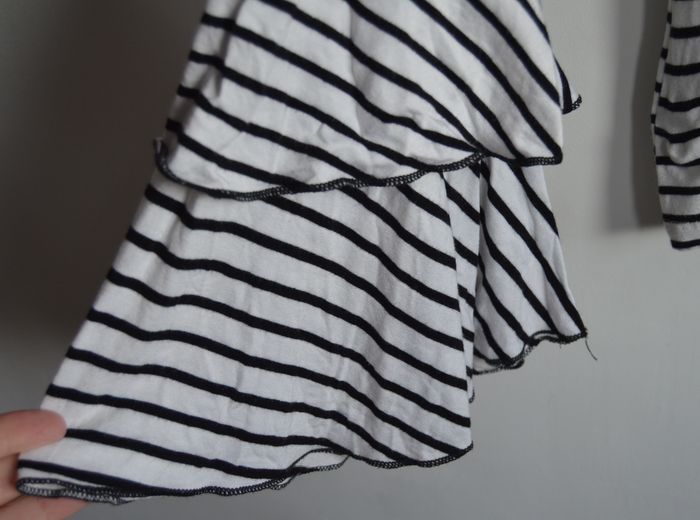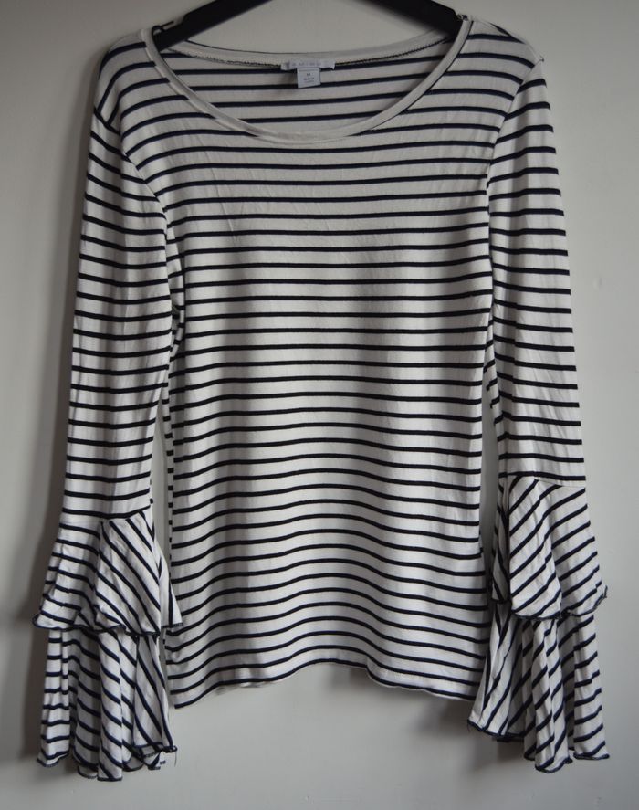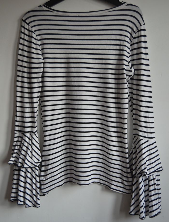 Haut femme AMISU à rayures blanches et noires, coupe fluide avec encolure arrondie. Manches longues avec volants étagés apportant une touche féminine et originale. Matière douce et souple, tombé naturel, style moderne et facile à porter.