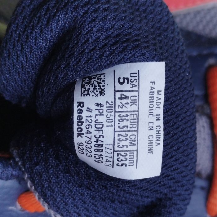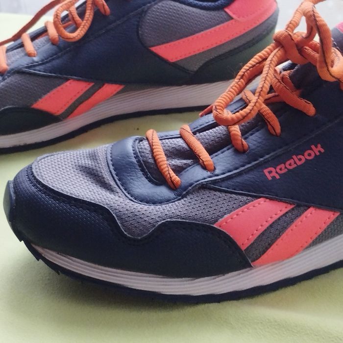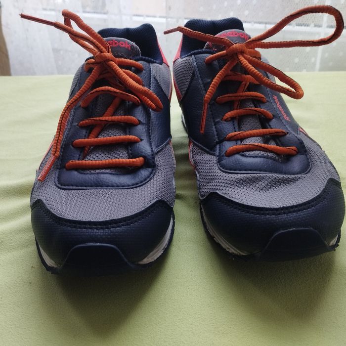 Basket à lacets de la marque Reebok pour garçon pointure 36,5 de couleur bleu marine, gris et orange fluo.