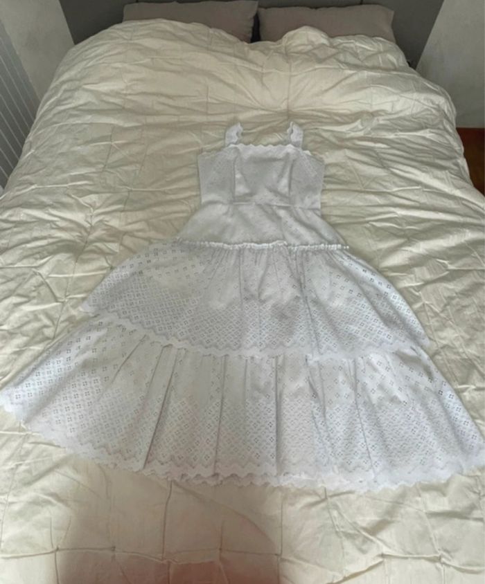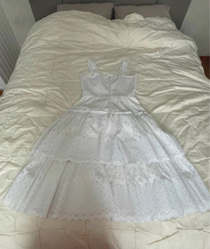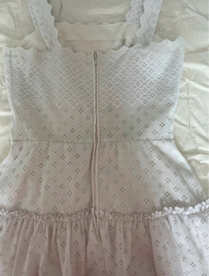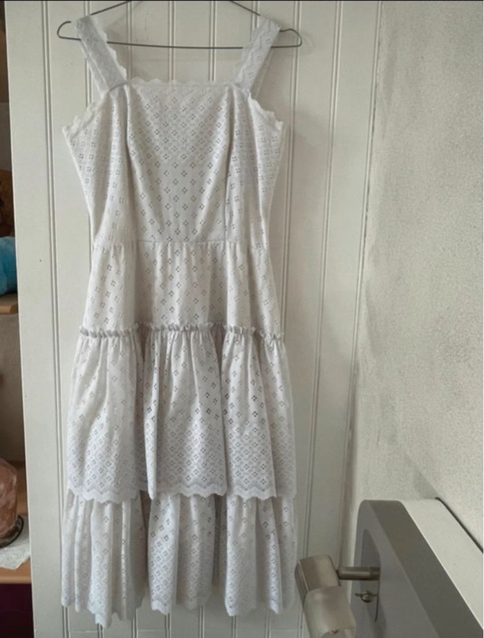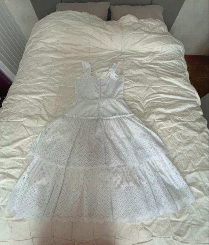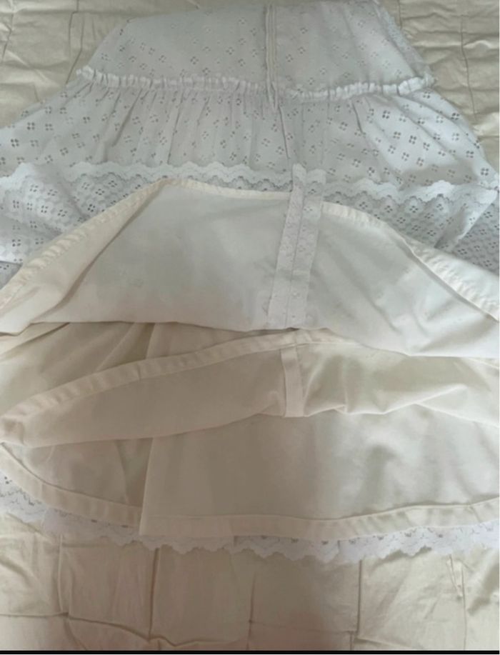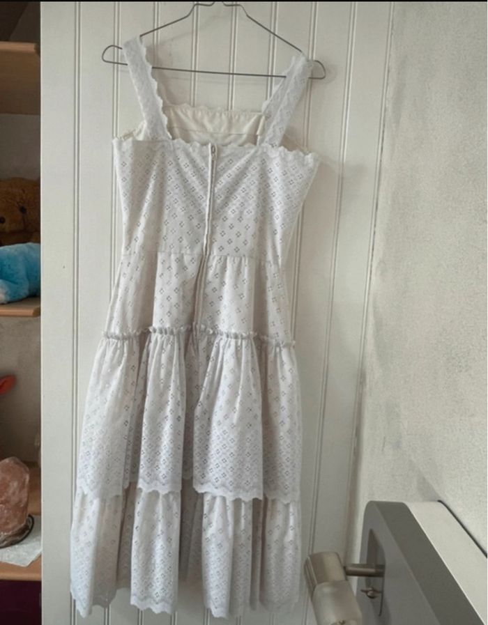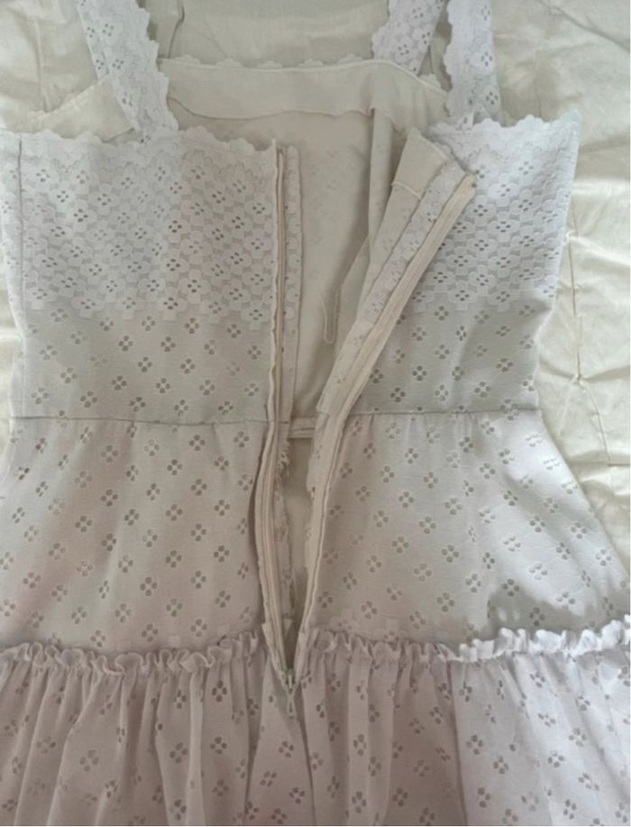 A servi une fois comme robe de mariée. La robe a été raccourcie. Il y a une fermeture éclaire sur l’arrière .