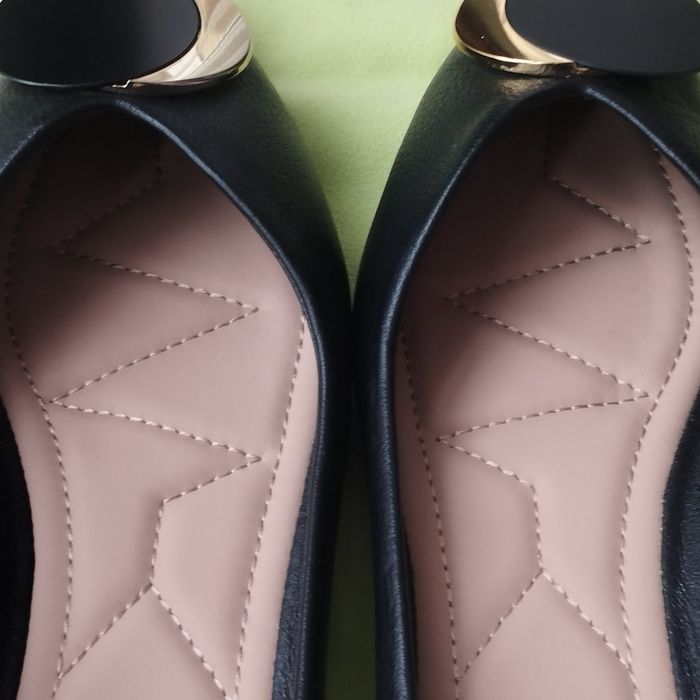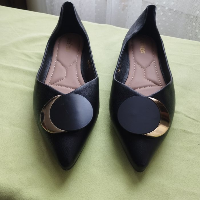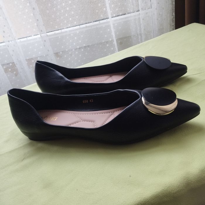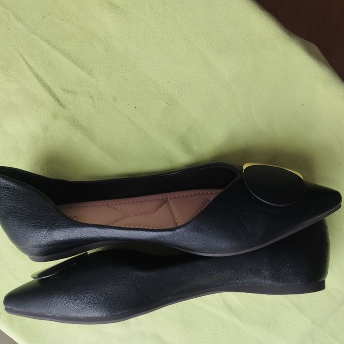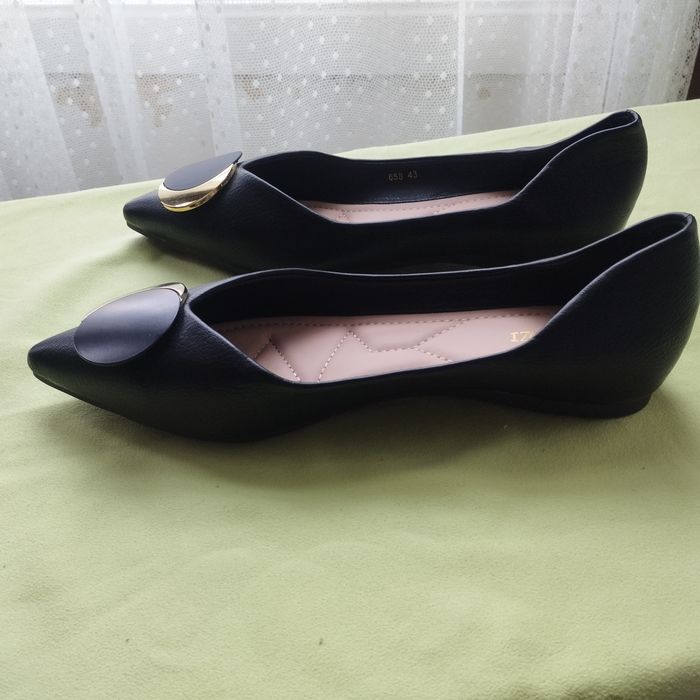 Ballerines élégantes pour femme, pointure 41/41,5. De couleur Noir Sur le dessus une grosse boucle noire et dorée. Intérieur semelle rembourrée. Neuf jamais porté !