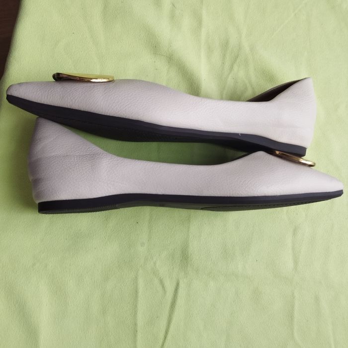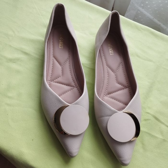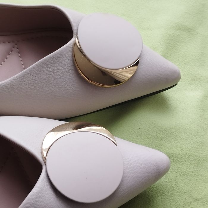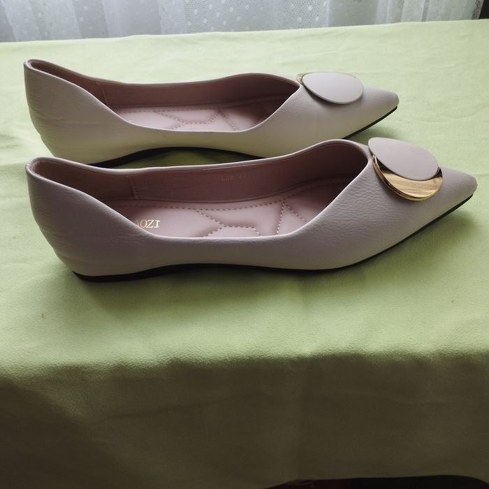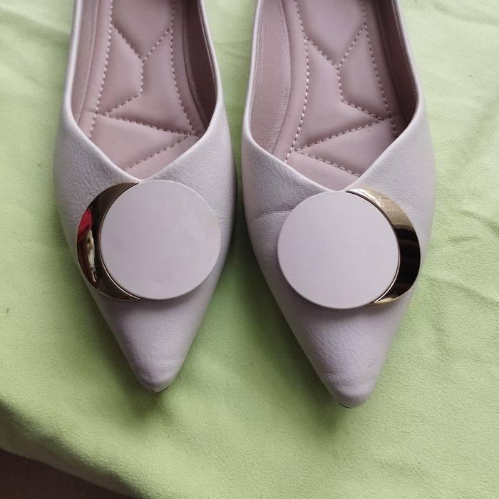 Ballerines élégantes pour femme, pointure 41/41,5. De couleur Beige/crème Sur le dessus une grosse boucle beige/crème et dorée. Intérieur semelle rembourrée. Portée 1 seule fois pour une occasion !