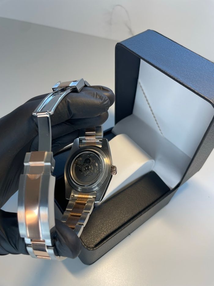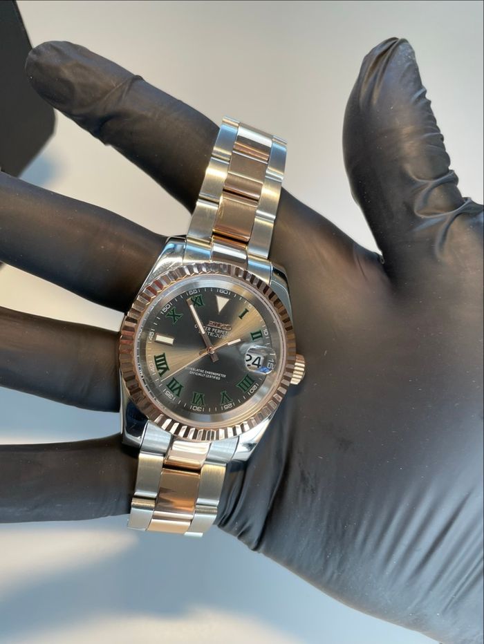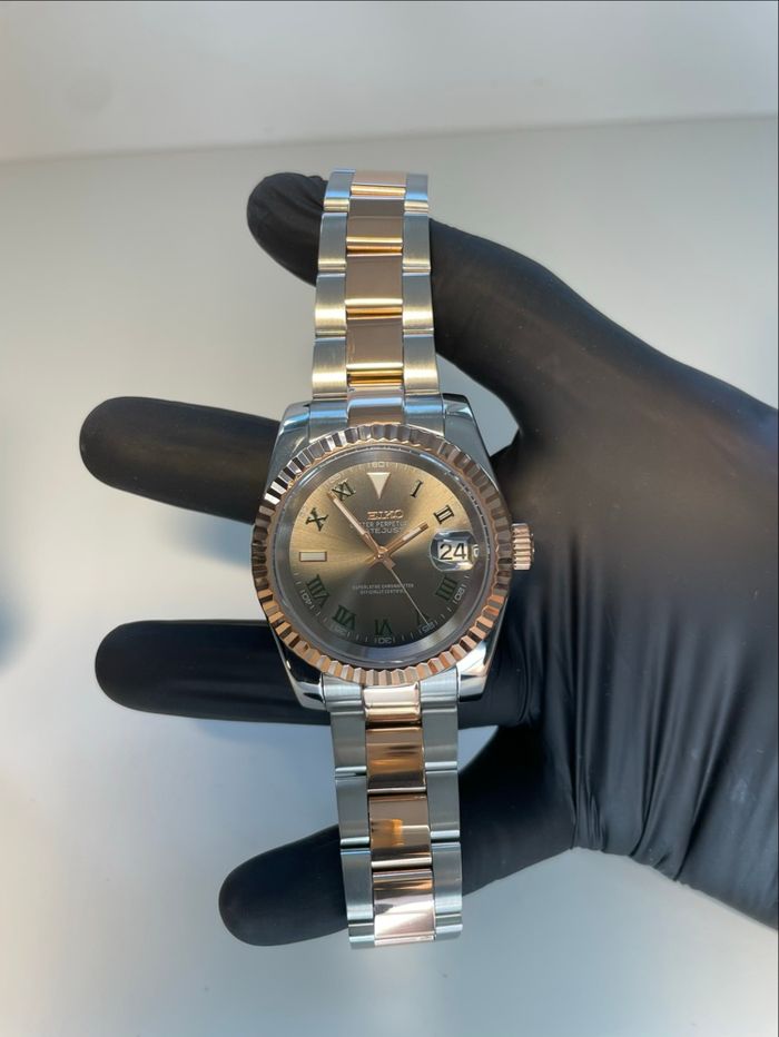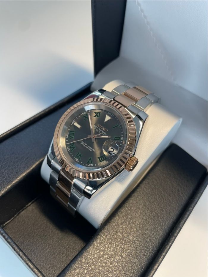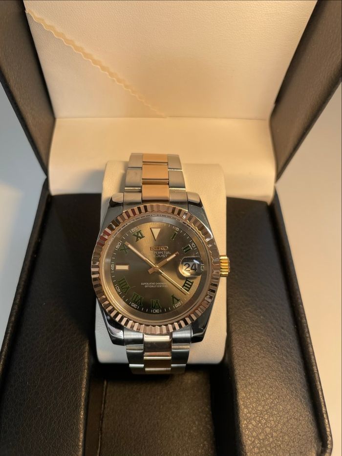 Magnifique montre avec mouvement automatique d’origine Seiko couleur or rose et argent cadran romain à contours d’index vert c’est une montre parfaite pour sortir en soirée, envoie rapide et propre dans les 24h
