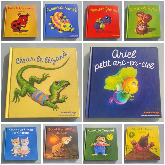 10 livres Drôles de petites bêtes : Nouvelle édition : - 5 : Camille la chenille - 6 : Marie la fourmi - 23 : Adrien le Lapin - 25 : César le Lézard - 50 : Louis le Papillon de nuit - 69 : Ariel, petit arc-en-ciel Ancienne édition : - 2 : Belle coccinelle - 30 : Maud la Taupe - 45 : Marion et Simon les chatons - 54 : Roméo le crapaud Tous en très bon état, seuls belle la cocinelle et maud la taupe sont un peu plus usés