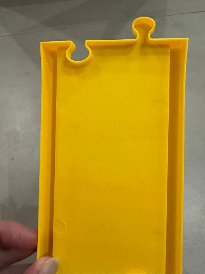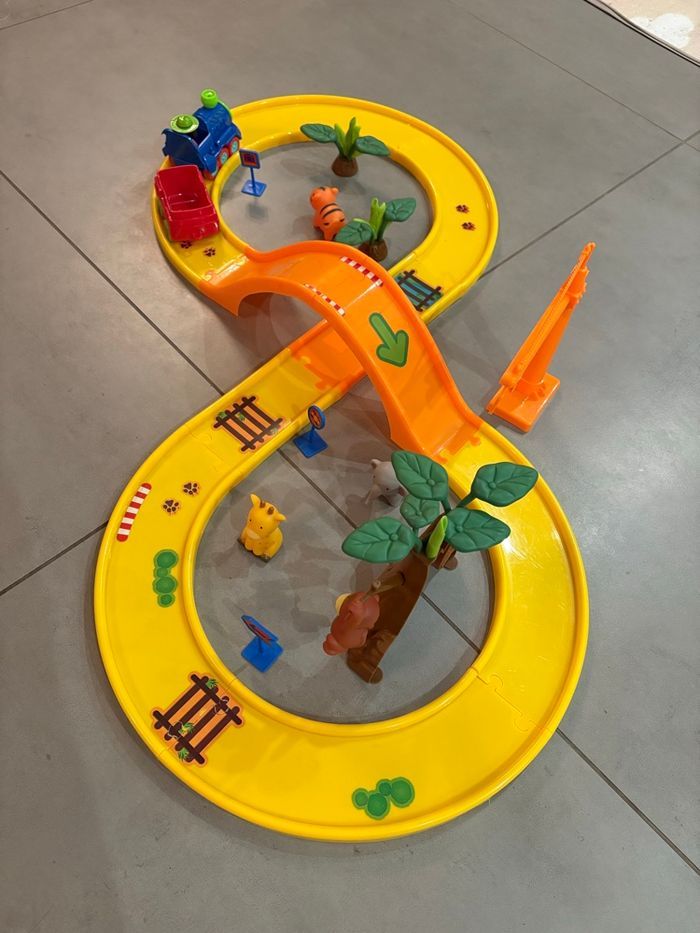 Très bon état 1 pièce des rails qui a été légèrement fissurée (voir photo) et qui comporte un petit bout de scotch transparent - nimpacte pas le rail ni même le circuit. 1er âge - des 18M