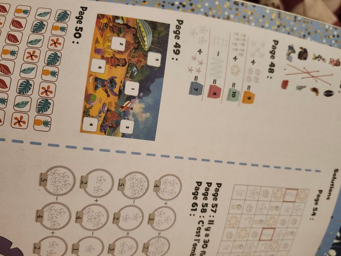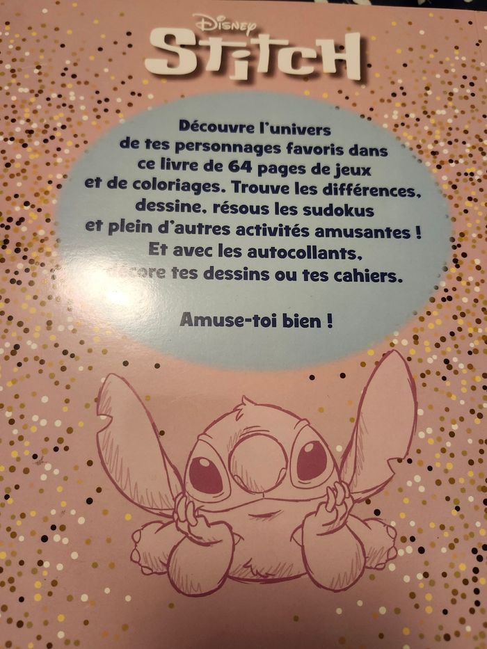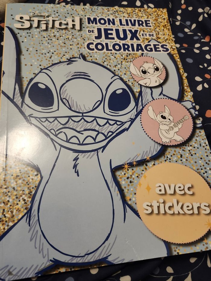Je vends ce livre de jeux et de coloriages Stitch, un produit Disney neuf et complet.