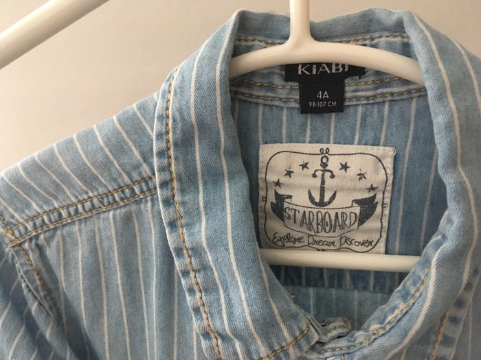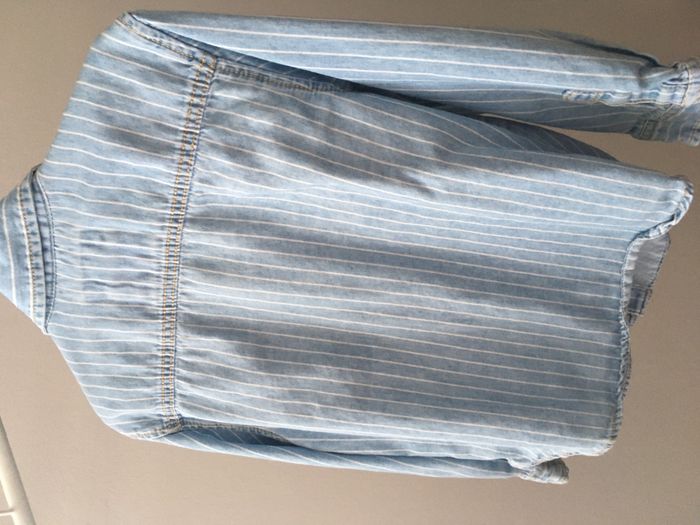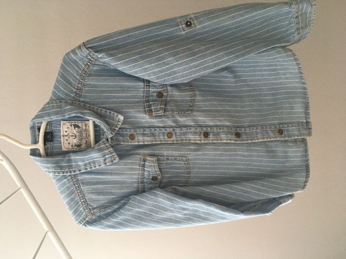 Chemise manches longues style jean bleu clair, taille 4 ans, en très bon état.
