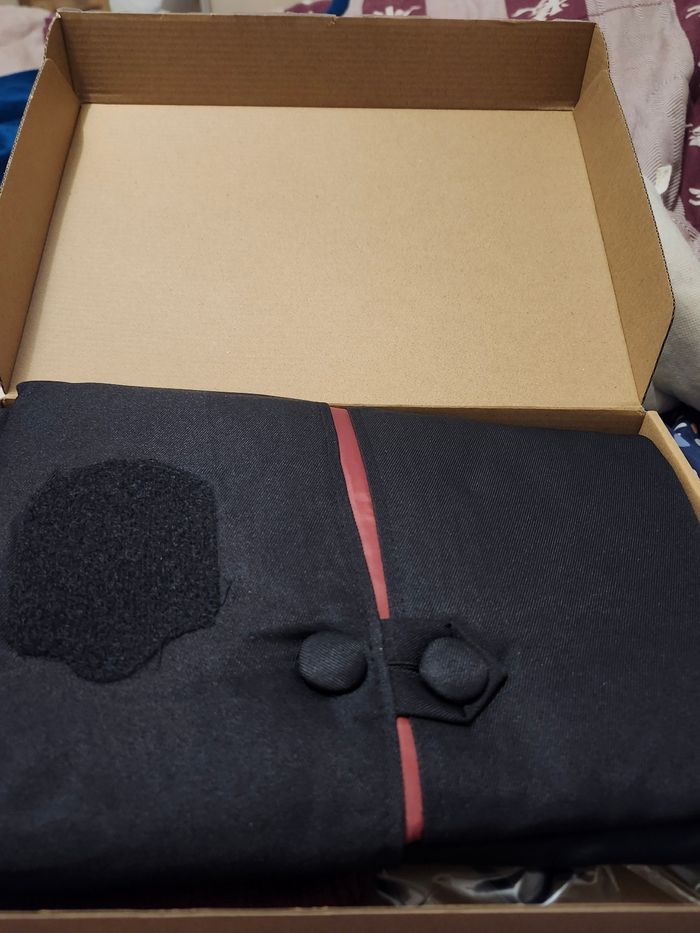 Cape longue noire à capuche, doublée d’un intérieur rouge rappelant la maison Gryffondor.