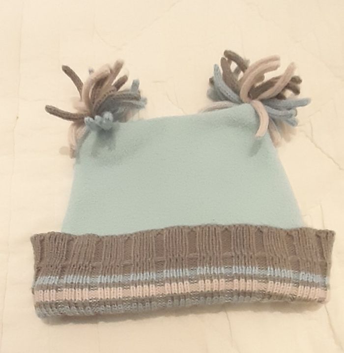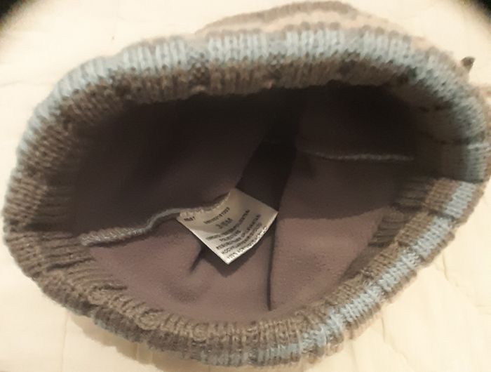 Polaire intérieur gris Polaire extérieur bleu clair Pompons bleu blanc gris comme le tour du bonnet . Très bon état Pour bébé 3/6mois