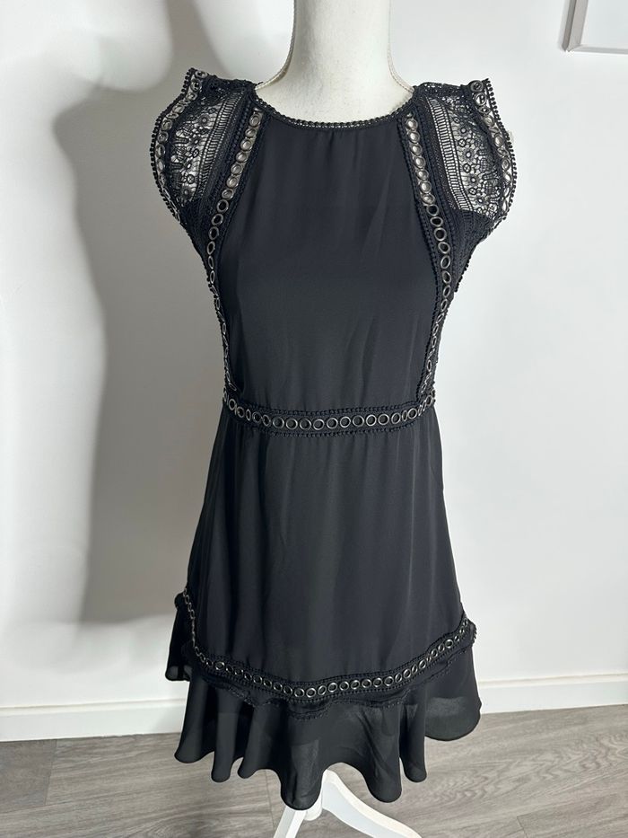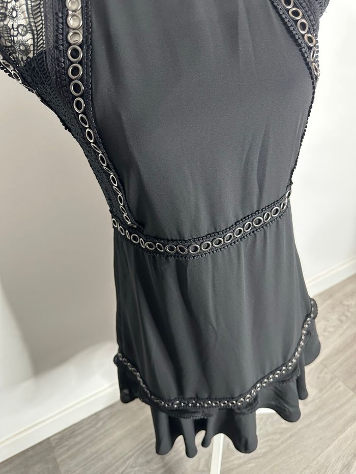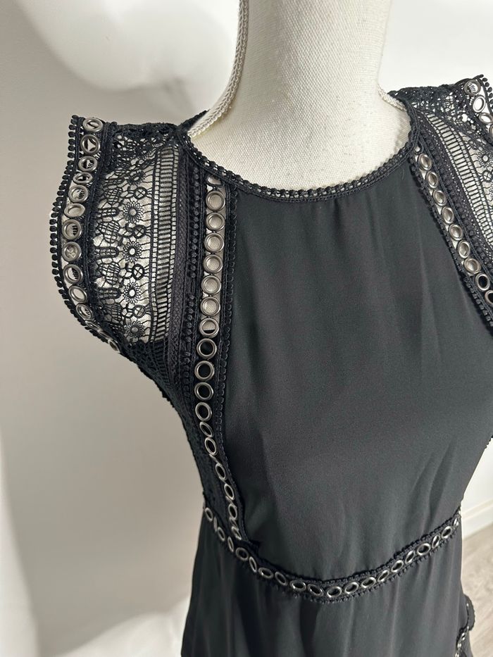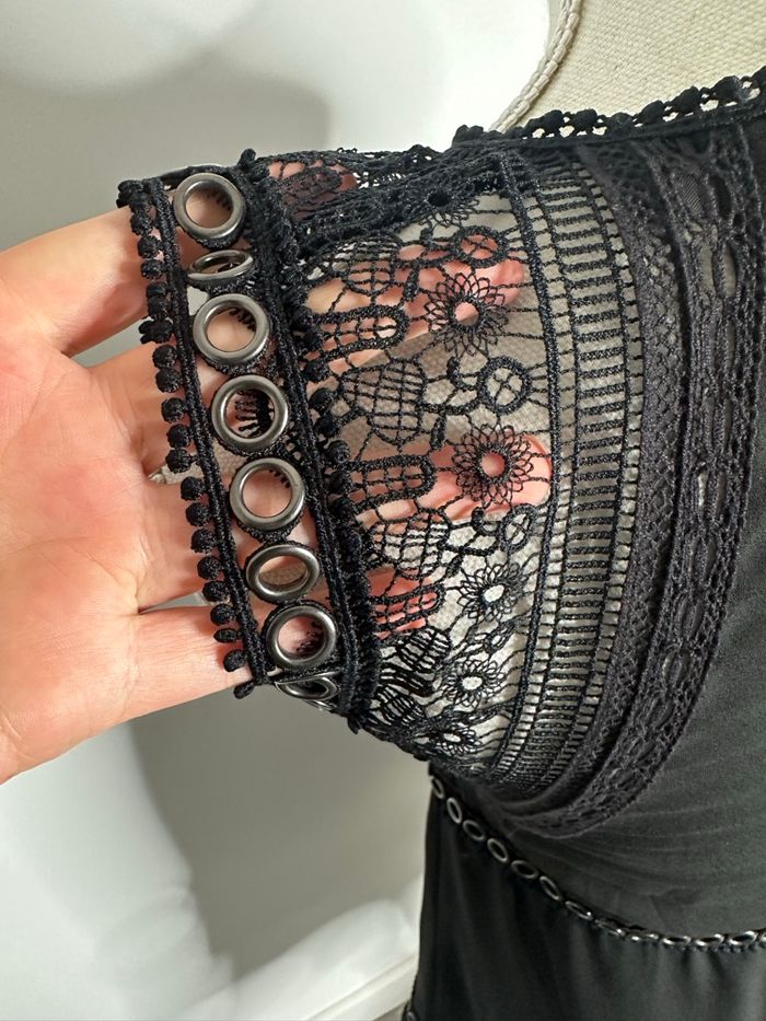 Petite robe noire - Excellent état - Taille 36 équivalent S - Black Premium - Long zip à l’arrière - Détails en dentelle - Œillets argentés - Doublure intérieure - Manches courtes - 100% Polyester - Style gothique, punk, rock, emo, grunge, chic Dimensions: - 46cm niveau aisselles - 91cm de long