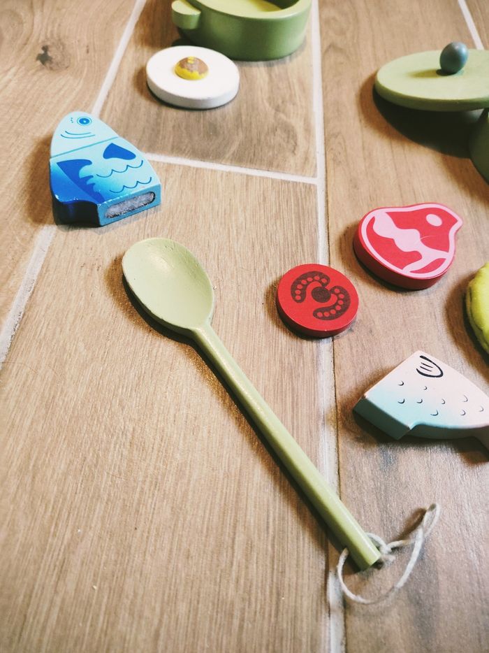 đ„Jeu d'imitation - Dinette en bois casseroles poĂȘle et divers aliments JB1916