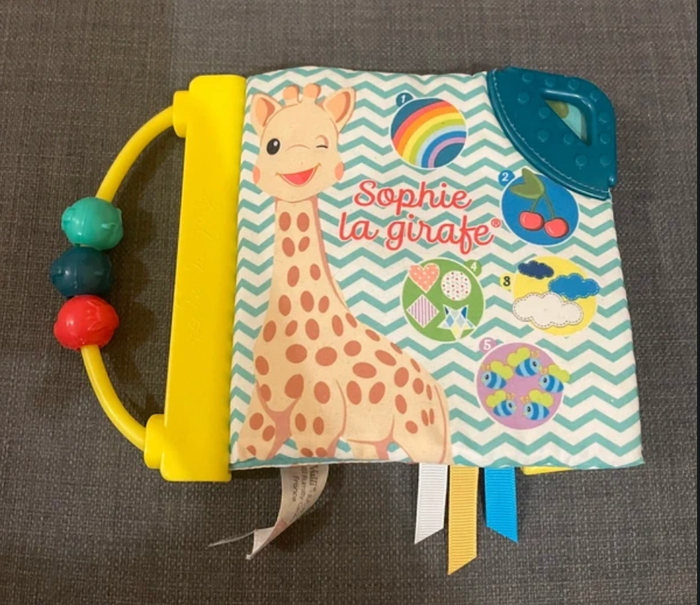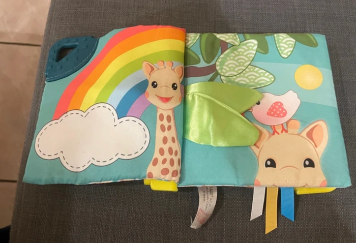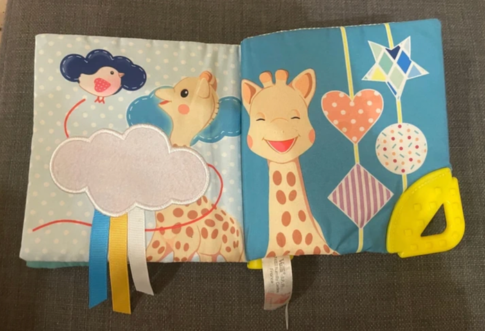 Bébé retrouve Sophie la girafe dans son livre et s'amuse à compter les éléments sur chaque page « 1 arc en ciel, 2 cerises, 3 nuages... »