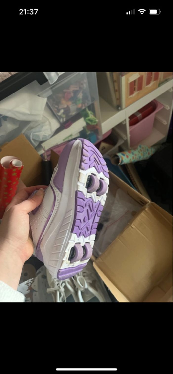 Les roulettes sont amovibles avec un outils ( fournis ) : photo des chaussures violette avec les roulettes de posé comme modèle .