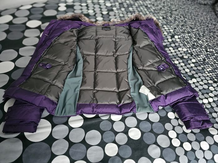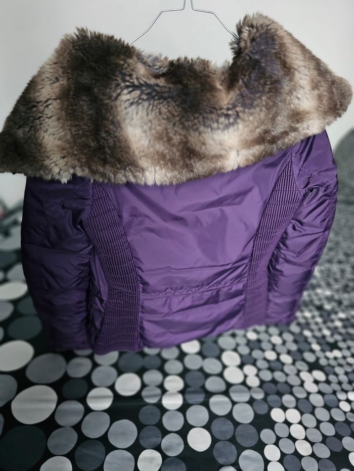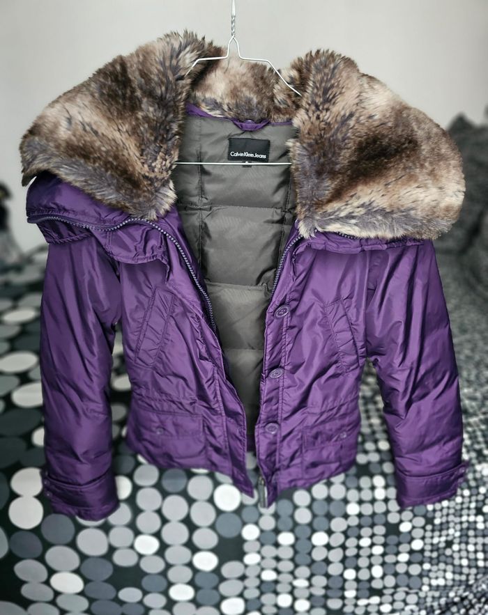 Doudoune Calvin Klein Jeans originale, coloris violet / prune. Modèle chaud et élégant, coupe féminine cintrée, fermeture zippée et boutons pression. Capuche avec fourrure amovible (peut se retirer facilement). Intérieur matelassé en duvet et plumes, idéale pour l’hiver. Poches pratiques à l’avant. Très bon état général. Catégorie : Femme Taille : S Couleur : Violet / prune Mesures à plat : - Aisselle à aisselle : 45 cm - Longueur (haut/bas) : 59 cm
