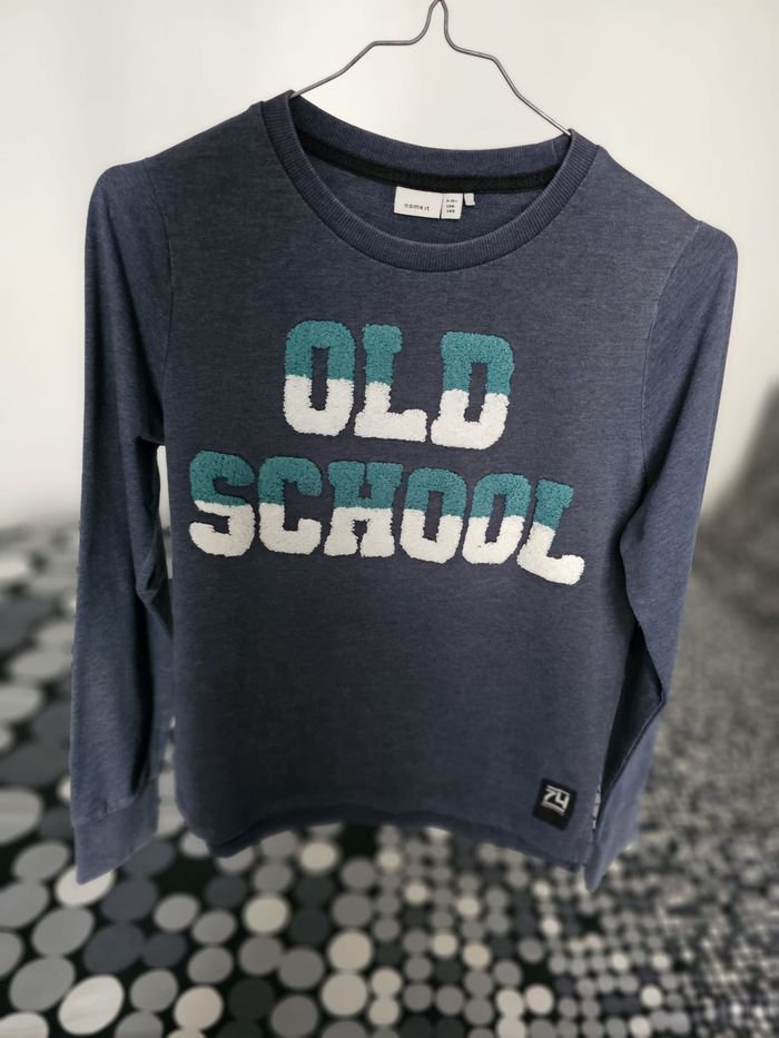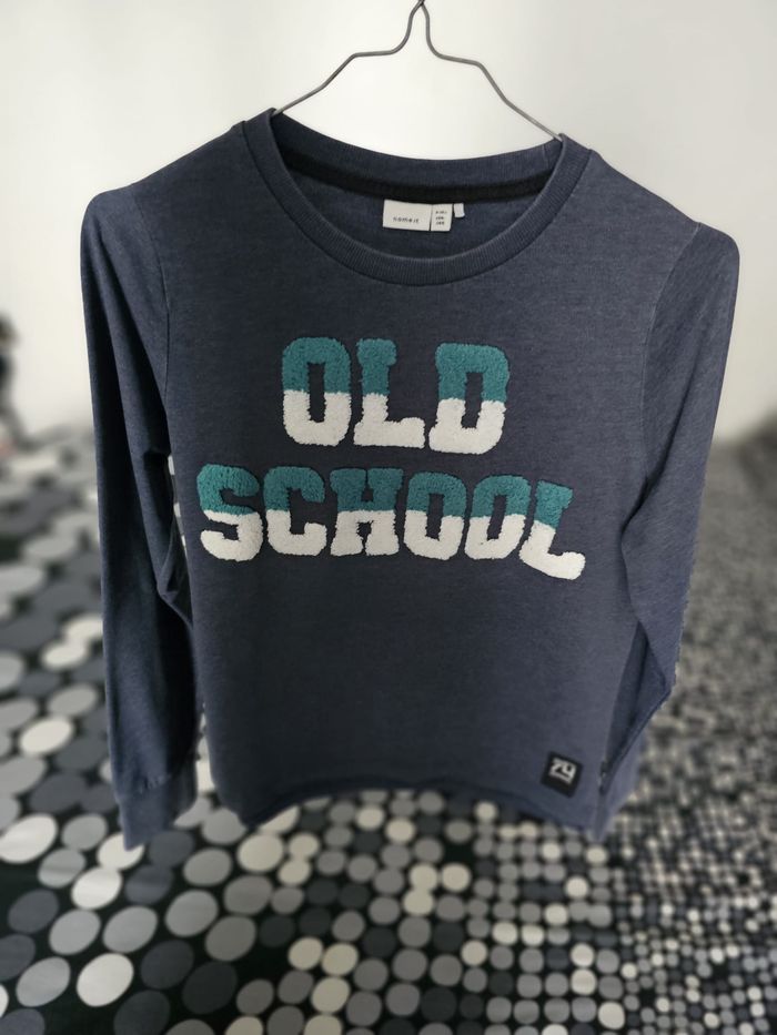 Sweat Name It original pour enfant, coloris bleu chiné avec inscription “OLD SCHOOL” en relief sur le devant. Modèle confortable et doux, idéal pour l’école ou le quotidien. Coupe droite, col rond, manches longues. Très bon état général. Catégorie : Enfant – Mixte (fille / garçon) Taille : 9/10 ans (134–140 cm) Couleur : Bleu Mesures à plat : - Aisselle à aisselle : 46 cm - Longueur (haut/bas) : 56 cm