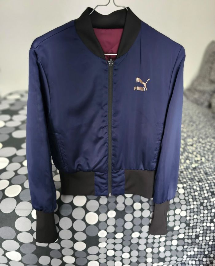 Veste bomber Puma authentique réversible, idéale pour varier les looks avec une seule pièce. Un côté bleu marine avec logo Puma brodé, l’autre côté bordeaux, coupe courte et ajustée. Fermeture zippée, finitions soignées, style sportif et urbain. Légère et confortable, parfaite pour la mi-saison. 👉 Pour femme 👉 Taille indiquée : M (équivalent 38/40) Mesures à plat : - Aisselle à aisselle : 49 cm - Longueur (haut/bas) : 58 cm
