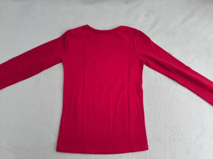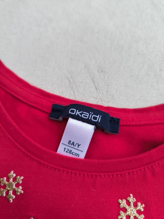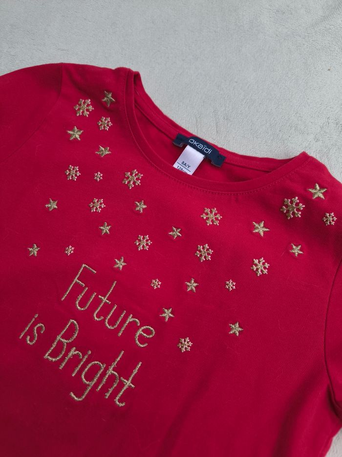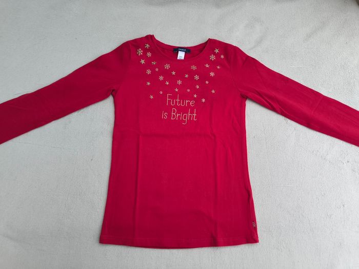 T-shirt à manches longues Marque Okaïdi Taille 8 ans, 128 cm • Coloris rouge, doré • Broderies étoiles, flocons de neige, inscription "Future is bright" • Tissu fin Peu porté, en très bon état #evelyne_filles_8ans #evelyne_filles