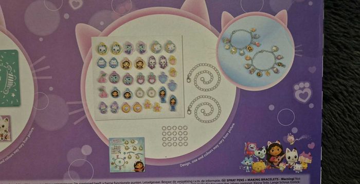 Bonjour, Ce joyeux ensemble de bricolage 2 en 1 de Gabby's Dollhouse te procurera des heures de plaisir ! L'ensemble comprend de quoi fabriquer des bracelets et des stylos vaporisateurs sur le thème de Gabby et de ses amis, comme Pandy Paws, Mercat et Cakey Cat. Avec le joyeux set de bijoux, tu peux facilement fabriquer les plus jolis bracelets à breloques de Gabby's Dollhouse avec des breloques faites d'autocollants pailletés en 2D. Profite de tes bracelets faits maison tous les jours, ou offre-en un à ta bestie en guise de bracelet d'amitié. Avec le stylo pulvérisateur, réalise tes propres créations Gabby avec un effet aérographe. Ce set contient 3 couleurs de stylo spray et 4 pochoirs différents. Crée tes propres modèles et libère ta créativité! Article neuf Envoi sous 48h-72h