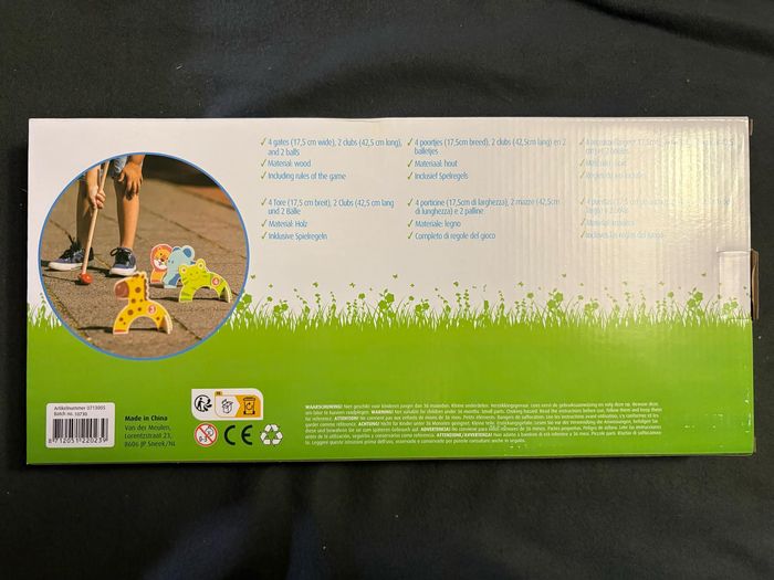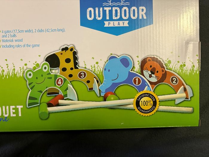 Outdoor Play Jeu de croquet en bois Animaux. Positionnez les arceaux en forme d'animaux dans la pelouse et lancez la partie. Frappez la boule et faites de votre mieux pour la faire passer sous les arceaux. Contenu : 4 arceaux (largeur 17,5 cm), 2 maillets ( longueur 42,5 cm) et 2 boules. Livré dans une boîte en couleur avec des instructions détaillées. Convient aux enfants à partir de 3 ans.