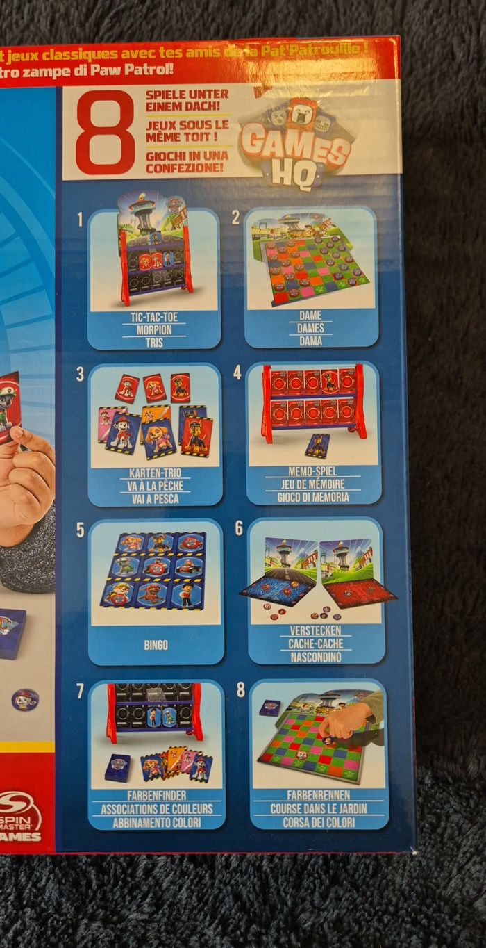 Paw Patrol : Games HQ – Collection de jeux avec 8 jeux classiques amusants pour enfants, tous dans le design graphique de la série télévisée à succès et avec tous les chiens populaires de la Pat' Patrouille. Les amis de la fourrure de la Pat' Patrouille invitent à leur siège de jeu. Ils ont apporté 8 jeux amusants qui nécessitent votre pleine mission. Plaisir de jeu garanti. La collection de jeux Pat' Patrouille de Spin Master Games contient 8 jeux passionnants sous 1 toit : dames, tic-tac-toe, mémo, bingo, cachette, localisateur de couleurs, trio de cartes et course de couleurs. Pour 2 à 4 joueurs à partir de 4 ans, durée de jeu : environ 15-20 minutes.