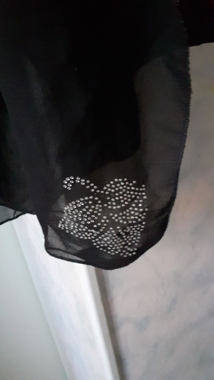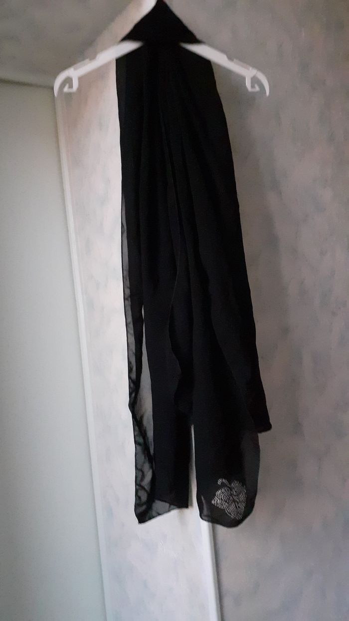 Vends une écharpe longue, couleur noir avec un motif et des strass sur un côté. Longueur : 178 cm Largeur : 68 cm.