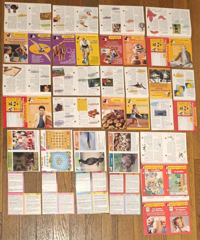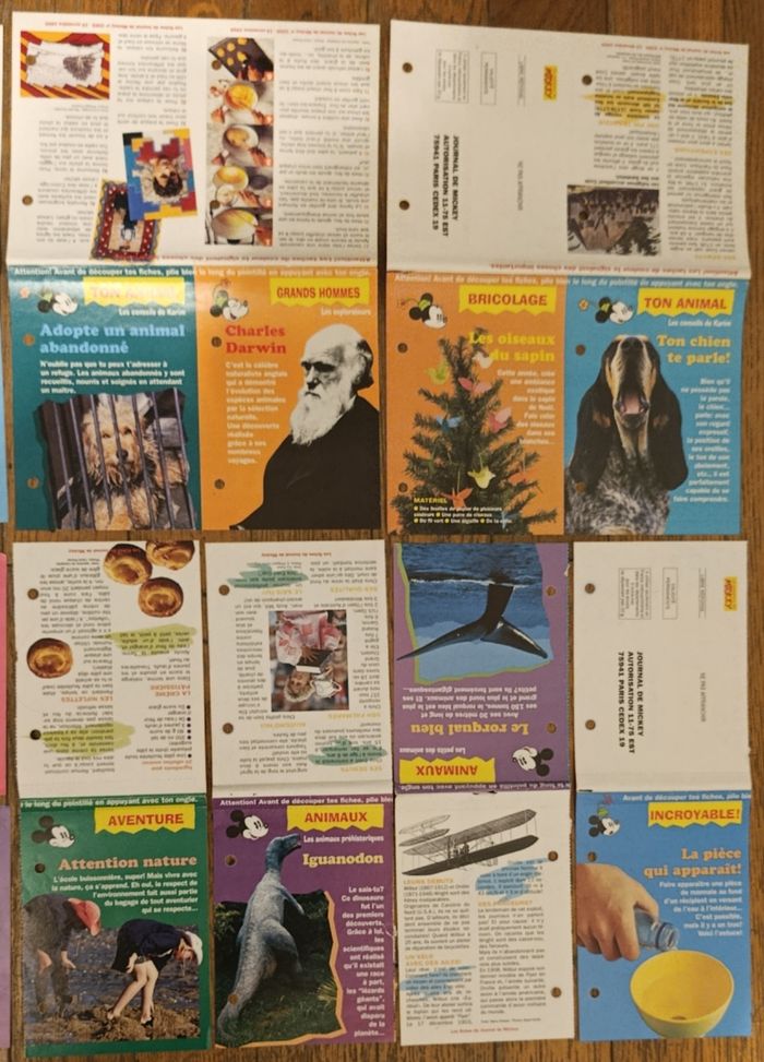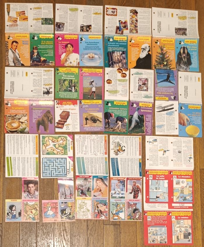 Lot de 59 fiches du Journal du Mickey Quelques traces d'usure Certaines plus ou moins usées Cf photos Fiches : Luke Skywalker, Donna Beverly Hills, Raphaël Classe mannequin, Edouard le iel et les abeilles, 2 fiches jeux bamboula valise de l'été, 8 fiches "bien dans ta maison", dessins animés, cuisine, bricolage, Grands hommes, animaux, Expériences... D'autres anciennes fiches et articles vintage disponibles, N'hésitez pas à regarder mes autres annonces