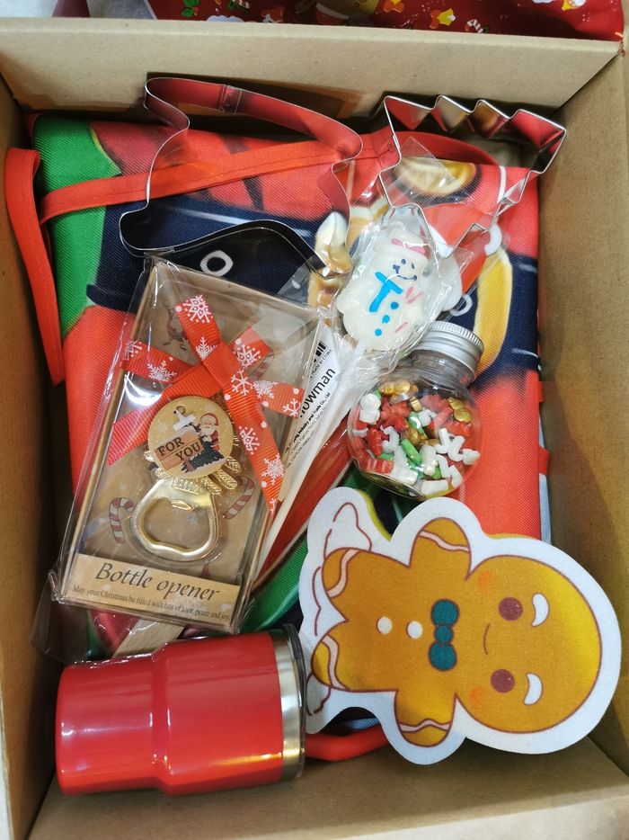 Elle inclut un tablier, une spatule, une boule rempli de bonbons sucré, un décapsuleur, une éponge, et un plateau en bois, elle est accompagnée d'un petit mug isotherme pour café et de 2 emportés pièces.