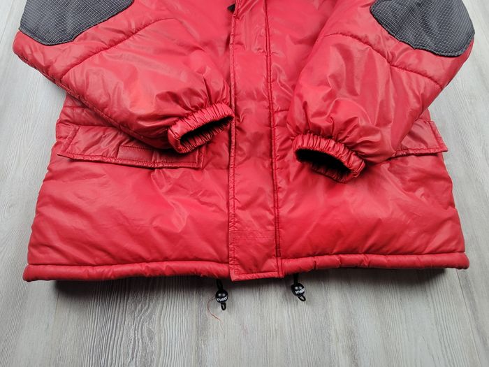 Coupe confortable, rouge intense avec renforts noirs aux épaules et aux coudes, typique des modèles K-Way vintage.