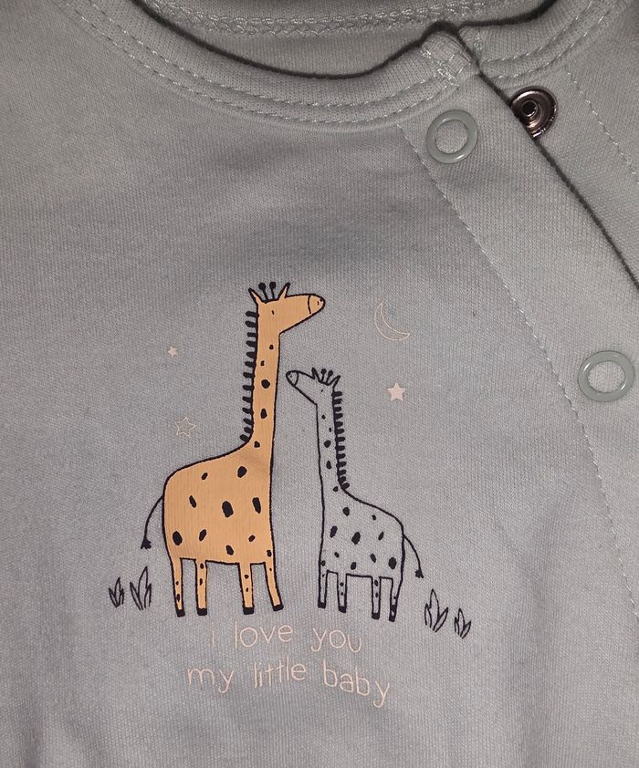 Pyjama coton une piece, couleur vert turquoise clair a motif floqué. Marque kiabi en 0 mois. 100% coton. Tache au niveau du bras ( voir photo ). Possibilité de le mettre en cadeaux pour l'achat des 3 pyjamas 0 mois. Remises sur lots activé ✅️ De plus, moins de frais de livraison 🪙📦 Envois rapide et soigné ! 🚚
