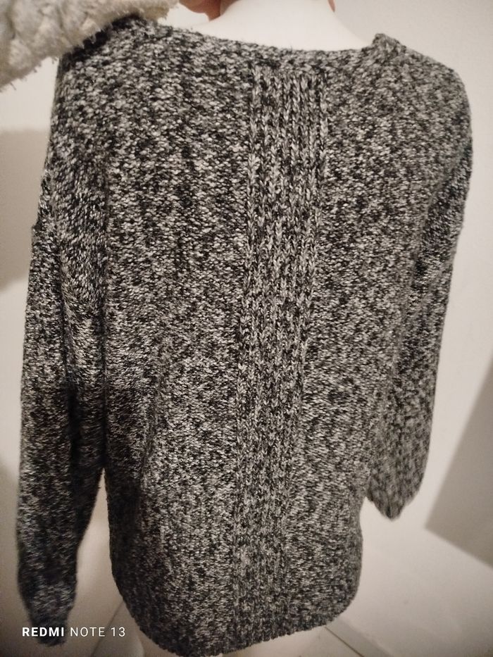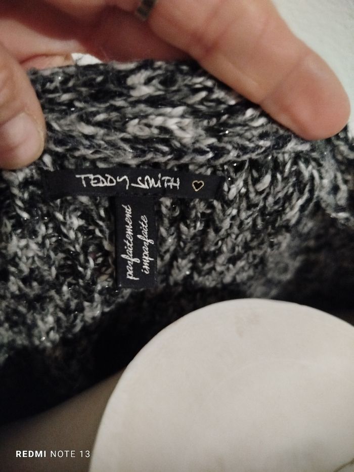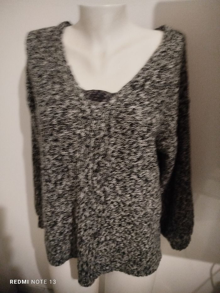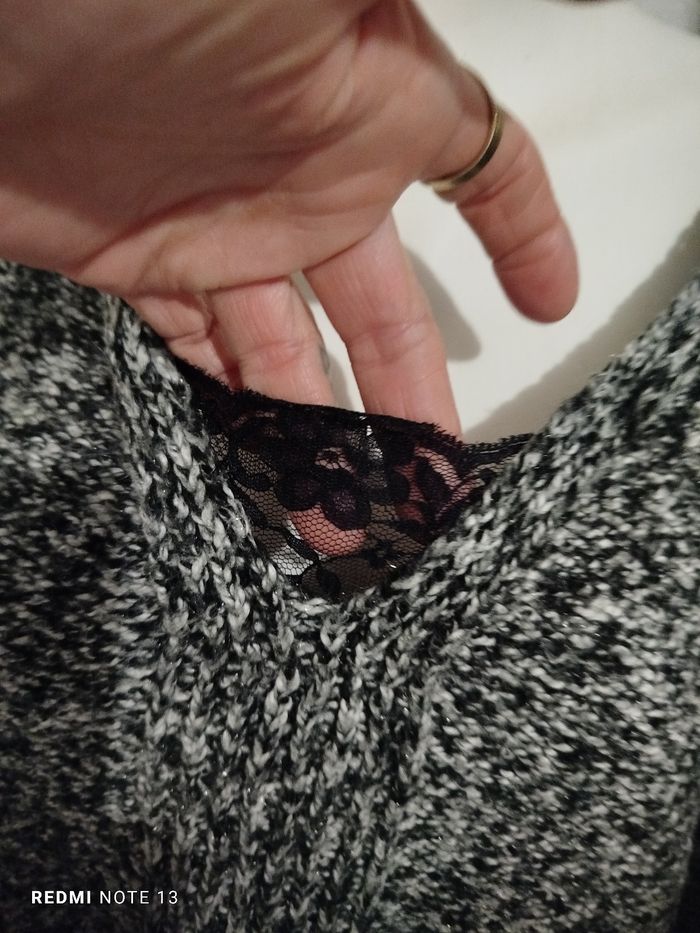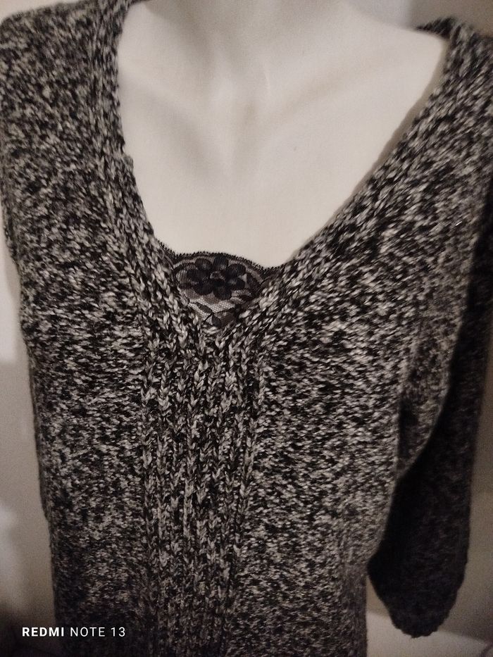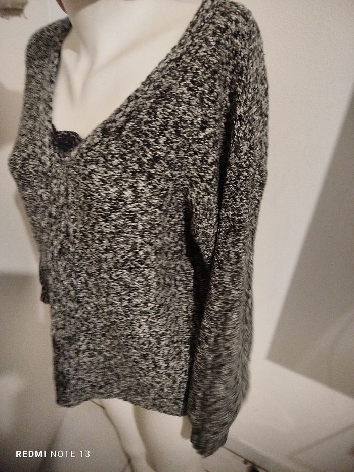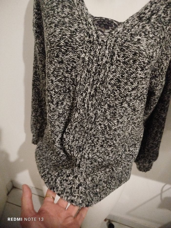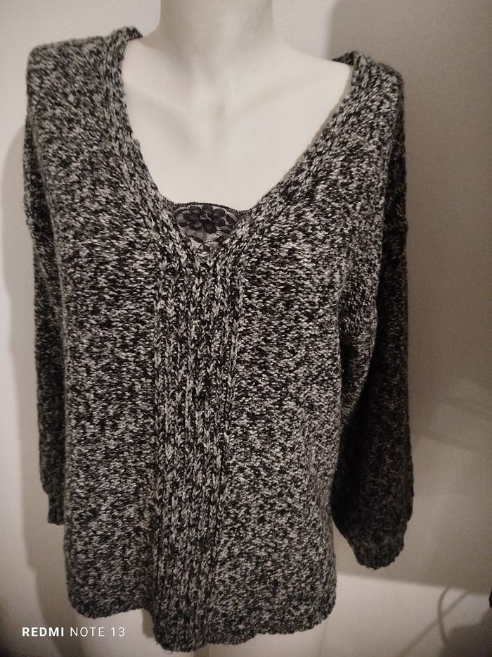 #kytieMfemme. Pull manches longues taille M de marque teddy Smith col v avec un de la dentelle dans le V anthracite et blanc en état neuf mesure des épaules 60 cm des aisselles 56 cm hauteur 70 cm 48% acrylique 42% cotton 7% polyester 3% polyamide et élastique réf H23
