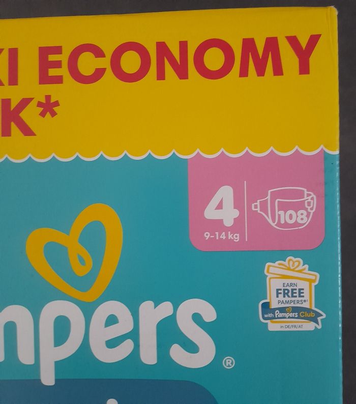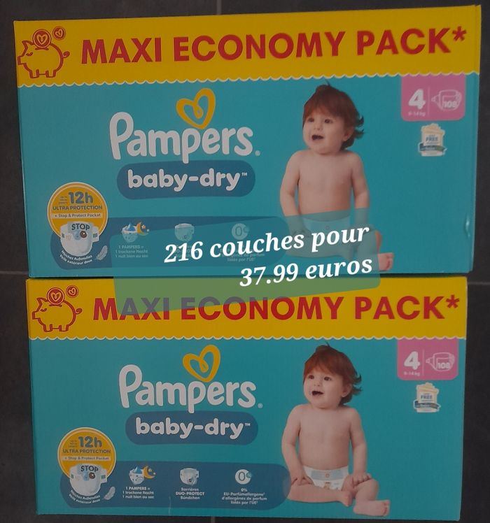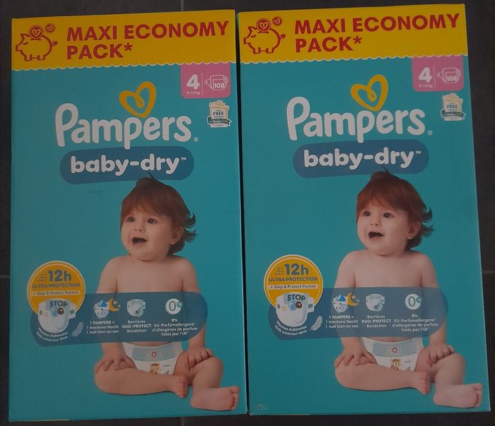 216 couches Pampers Baby-Dry, taille 4, dans leurs boîtes neuves et scellées (2 packs “Maxi Economy”).