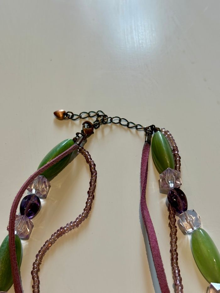 Magnifique collier de style ethnique et bohème, orné de perles aux tons violet et vert qui apportent une touche de couleur élégante et originale.