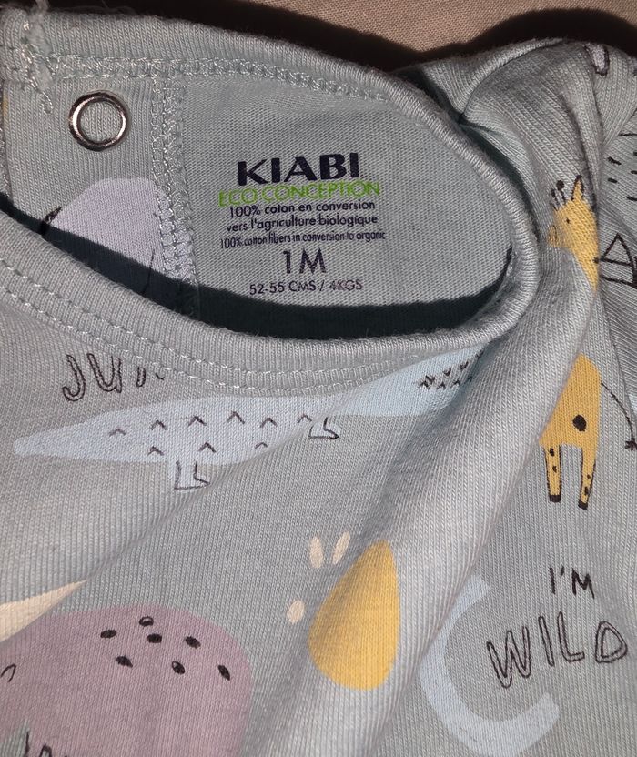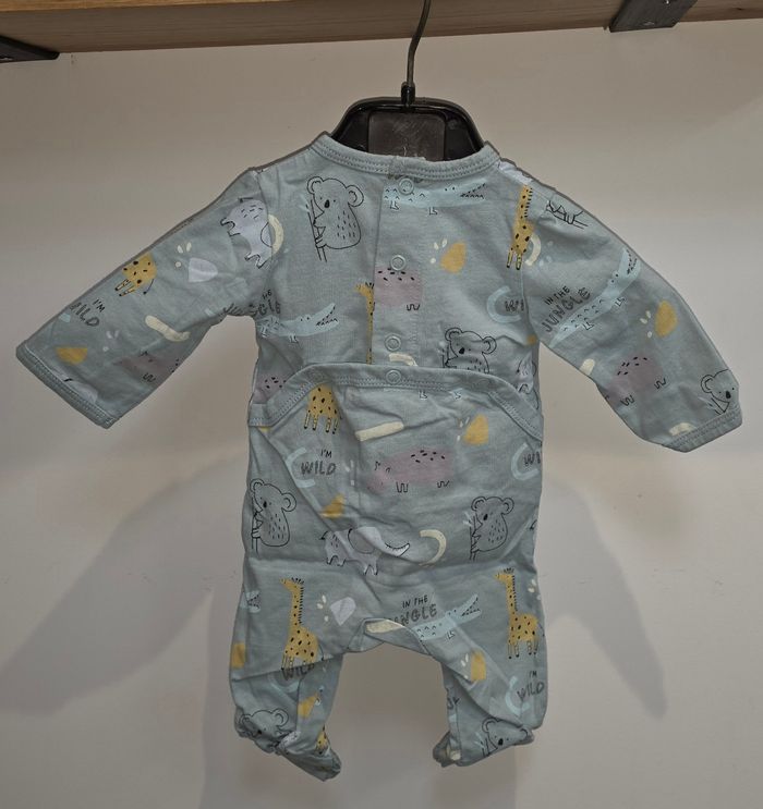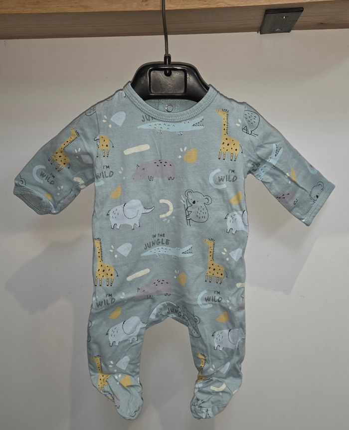 Pyjama une pièce, couleur vert d'eau a motifs animaux. Ouverture par l'arrière. Marque kiabi en 1 mois. Remises sur lots activé ✅️ De plus, moins de frais de livraison 🪙📦 Envois rapide et soigné ! 🚚