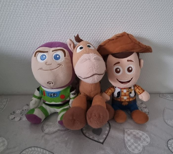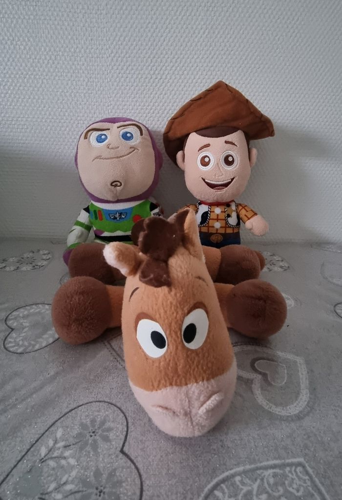 Je vends ce lot de 3 peluches Toy Story : Buzz l'éclair, Woody et Pile Poil.