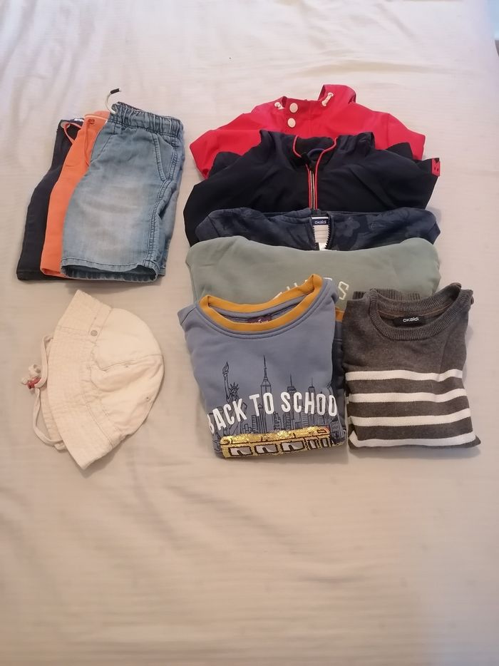 Lot de vêtements en très bon état marque okaidi. 3 shorts 1 ciré 1 kway 4 pulls