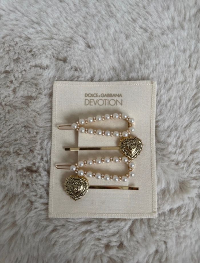 Jamais utilisé, superbe ensemble de quatre épingles à cheveux DOLCE & GABBANA "Devotion" doré, composé de deux paires de pinces à cheveux, l'une en acier doré vieilli avec le cœur sacré iconique portant le logo "Devotion", l'autre en métal doré et perles