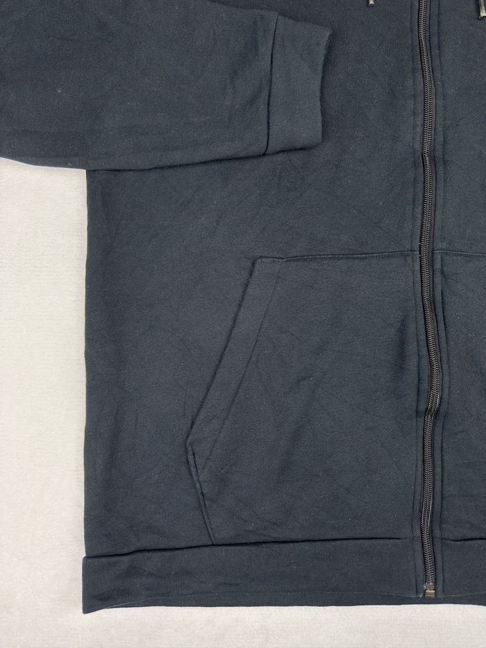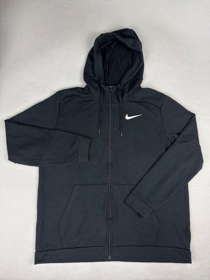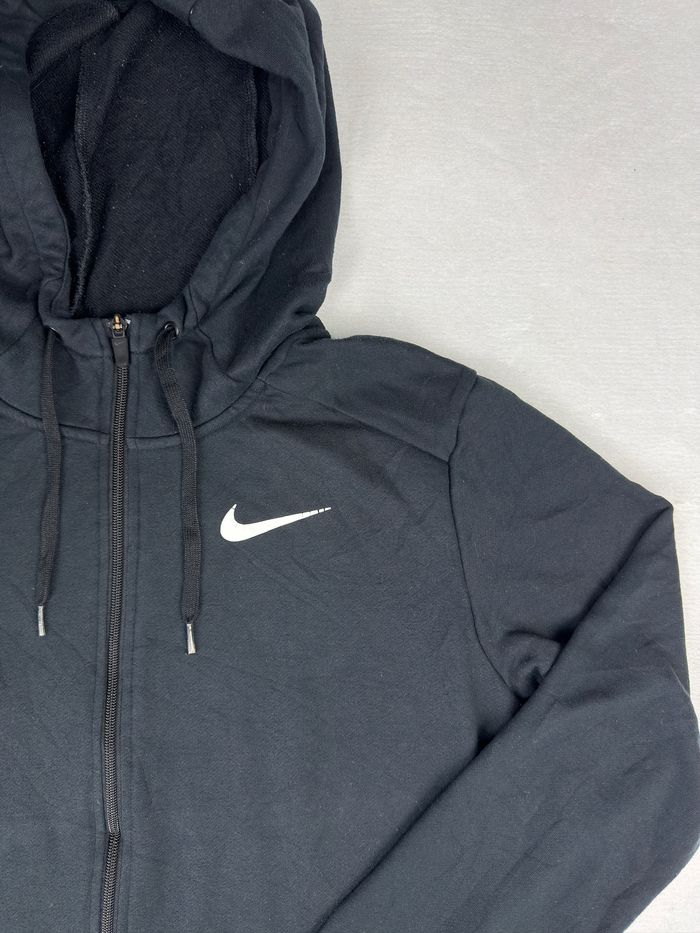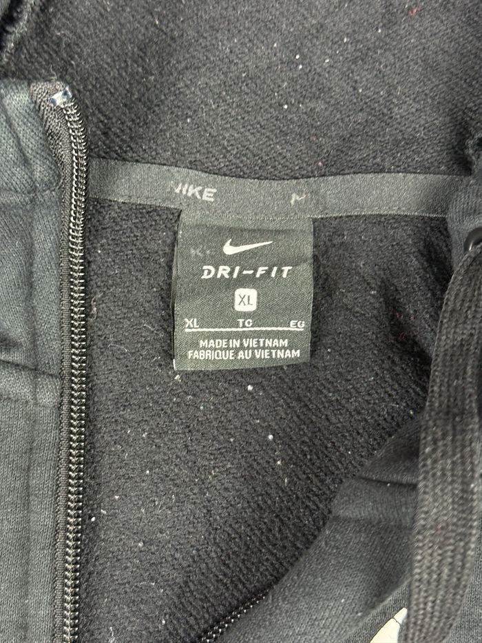 Sweat zippé Nike Dri-Fit noir, logo blanc sérigraphié (usé). Capuche ajustable, poches frontales, intérieur polaire léger. Très bon état.