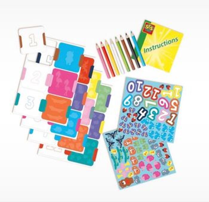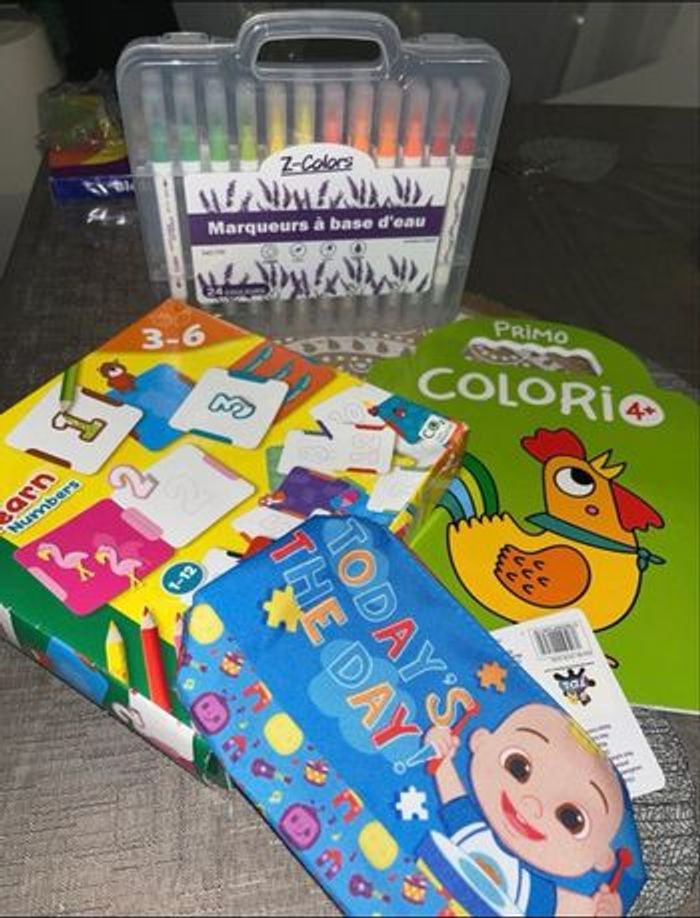 Lot activité enfant Trousse- J'APPRENDS LES CHIFFRES( boite légèrement abîmer sur les côtés dû au transport mais pas ouverte)- cahier de dessins- marqueurs à base d’eau.