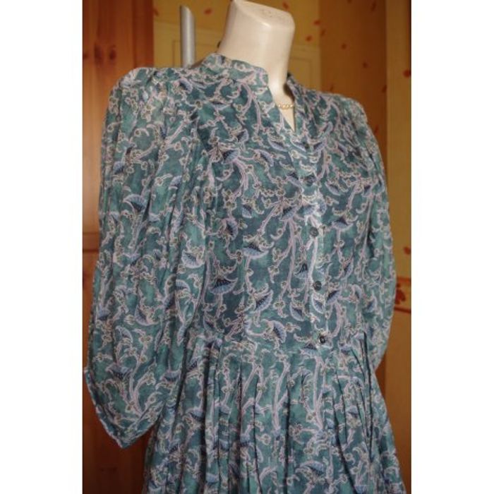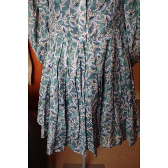 Col tunisien - Coupe évasée - jupe à plis plats - Motif fleuris - Doublure sur la partie inférieure.