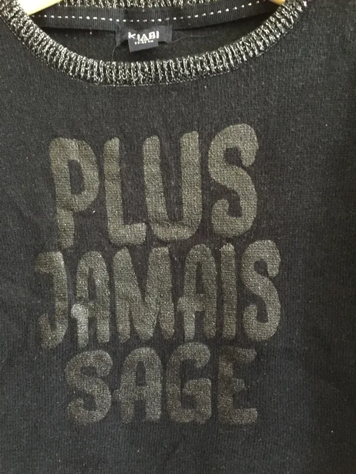 Pull marine Kiabi 18M, "Plus jamais sage", encolure et base fil brillant, 2 boutons dorés sur l'épaule, coton - TBE