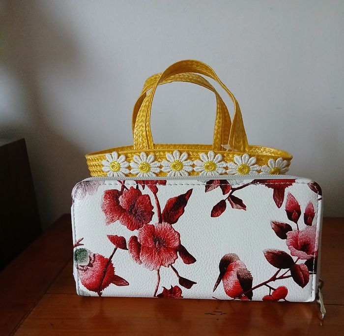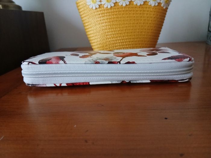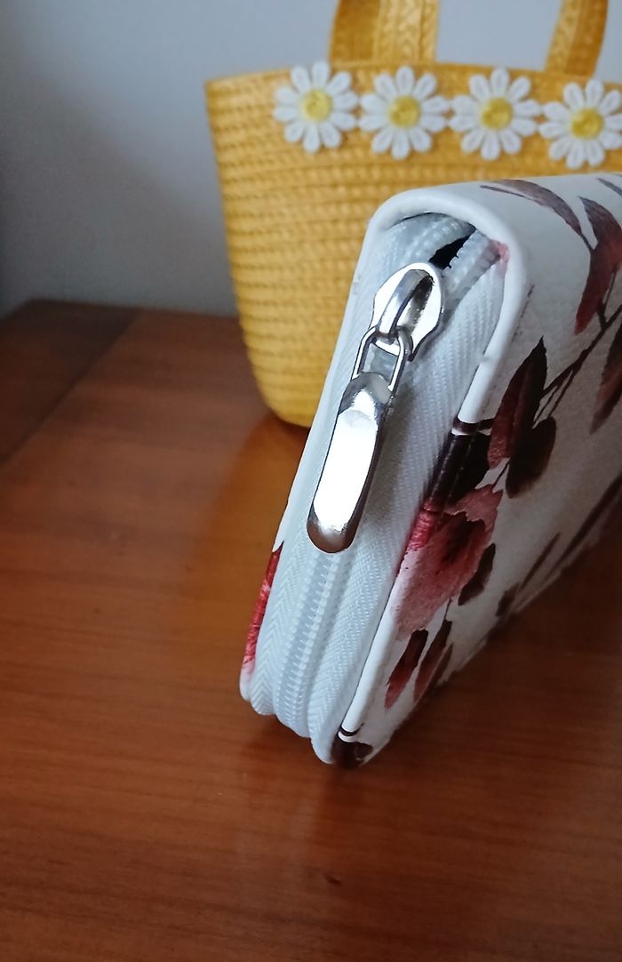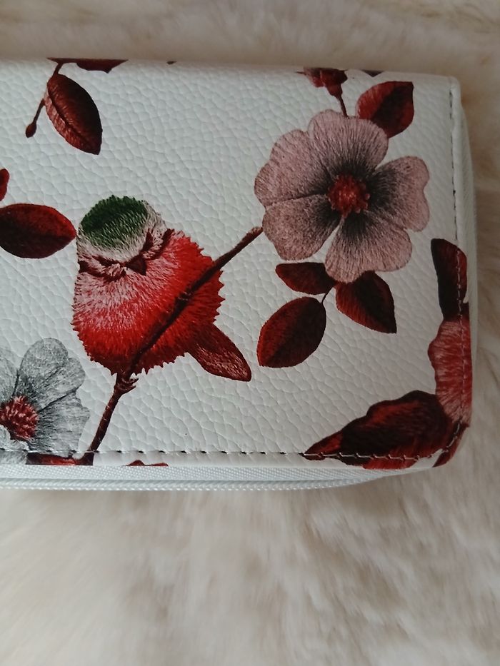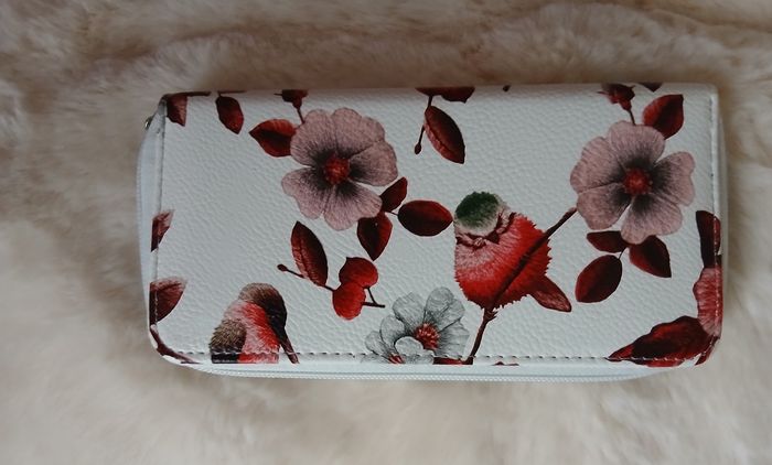 Article Neuf. Pochette zippée; motif floral & Oiseaux; tirette en métal argenté. Compartiment central zippé pour pièces de monnaie; plusieurs emplacements pour billets ou autres ( tickets, petits documents) 8 emplacements pour cartes. Longueur maxi de 18,5 cm, hauteur maxi de 9,5 cm. En simili cuir, lavable en surface // Voir photos pour détails