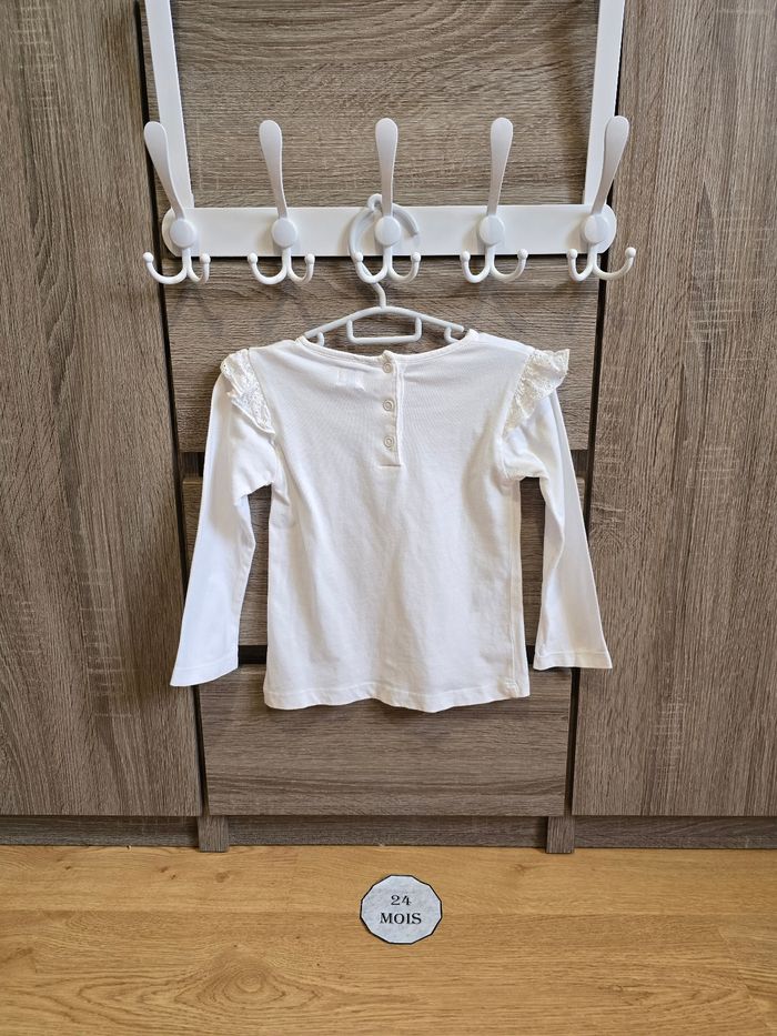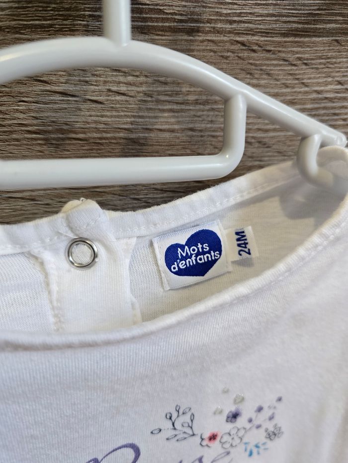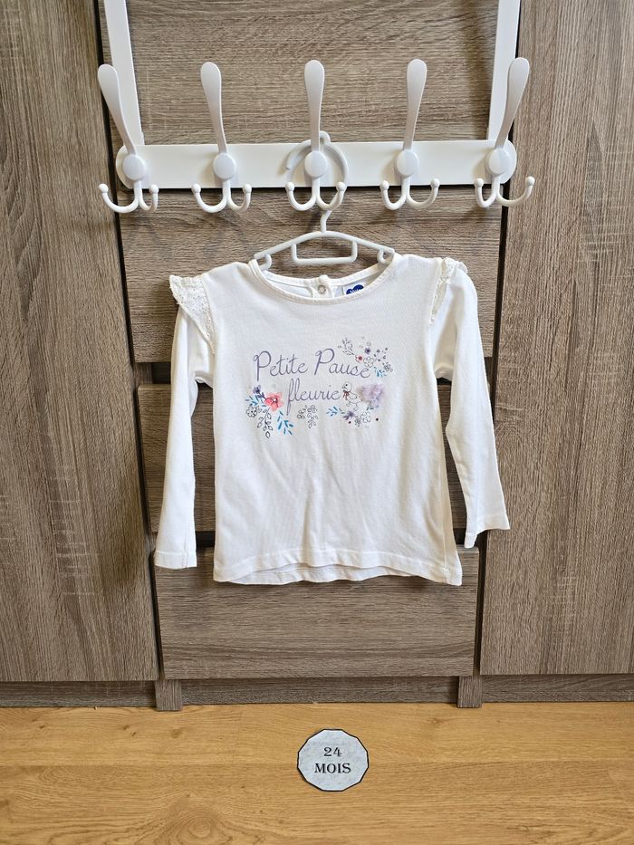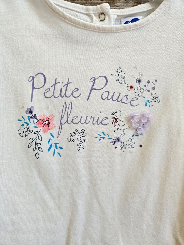 - Un t-shirt manches longues blanc avec écrit "Petite pause fleurie" et des fleurs