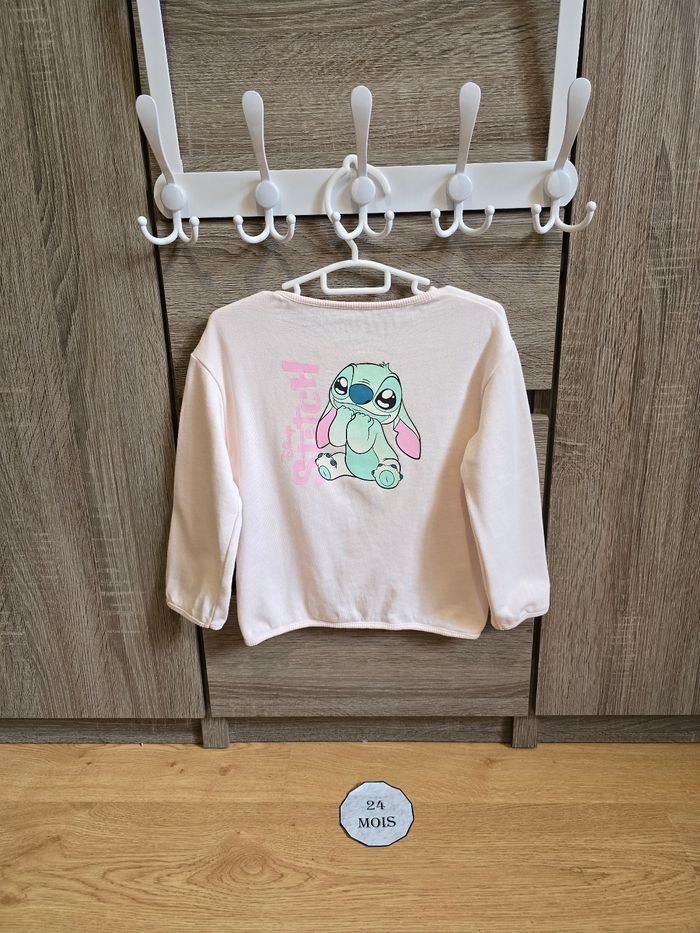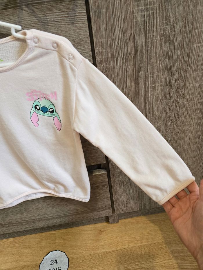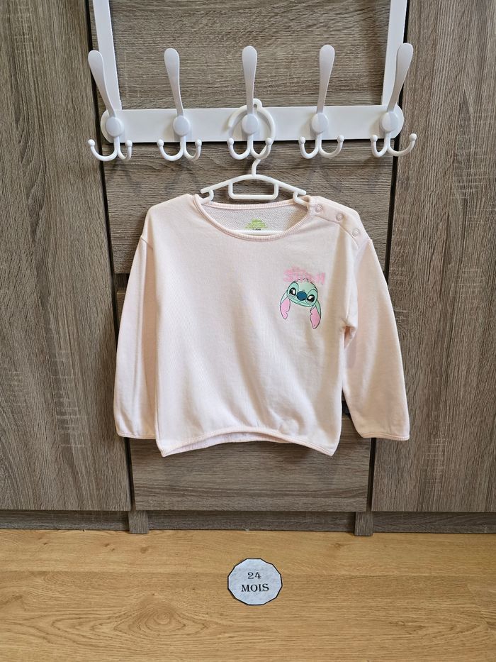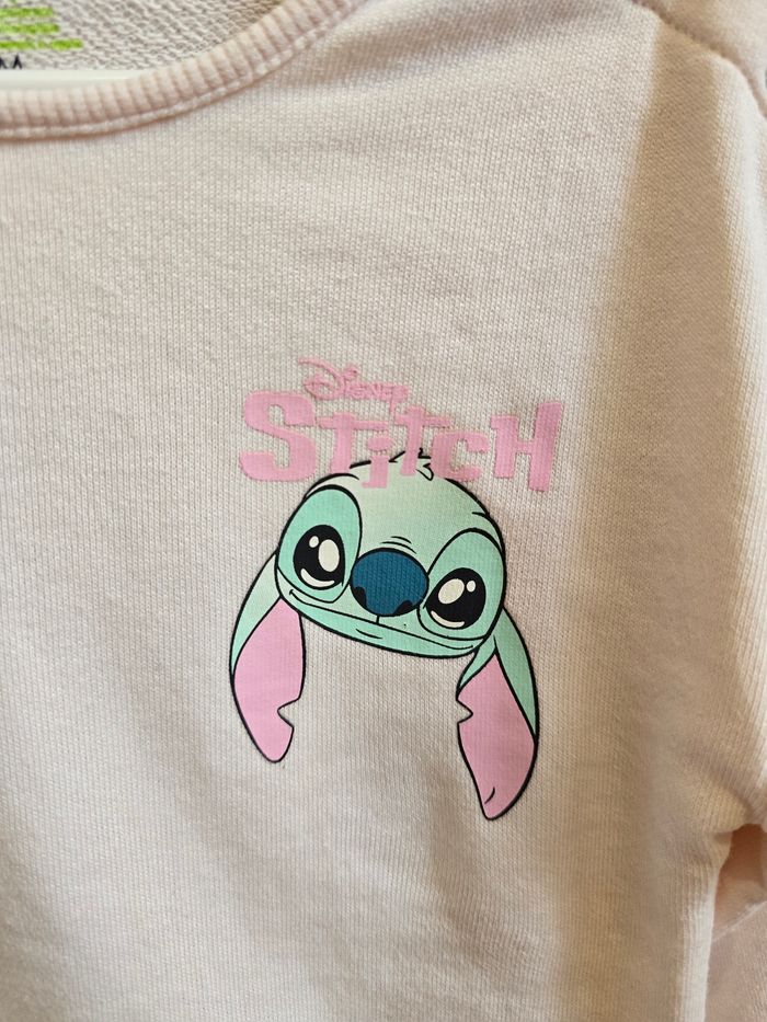 - Un sweat/pull rose avec un imprimé Stitch sur le devant et également sur l’arrière