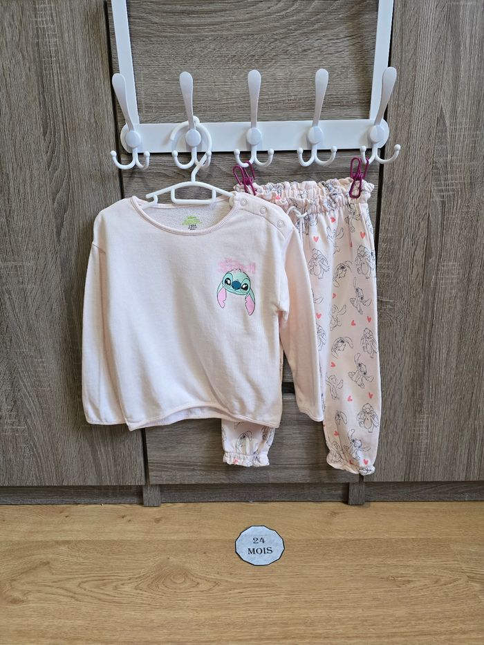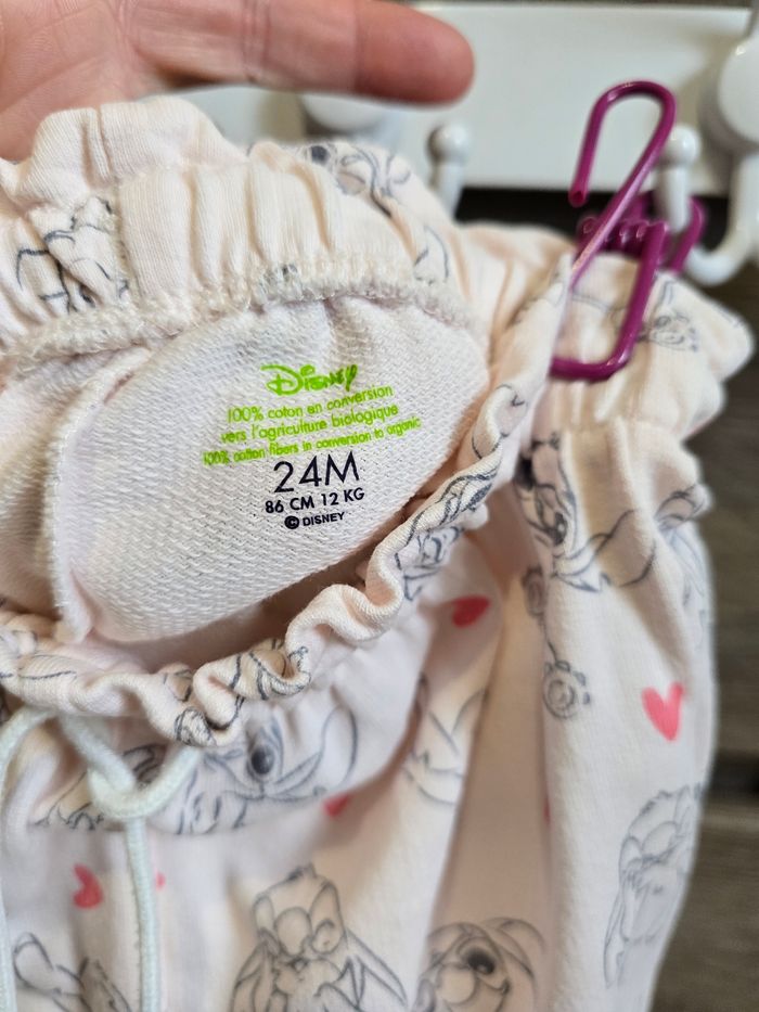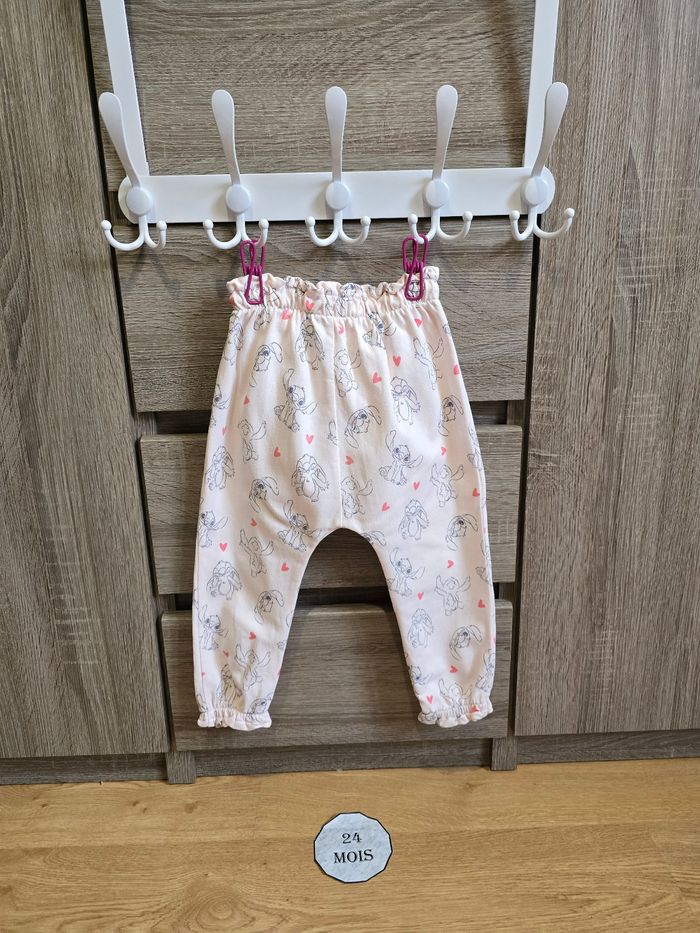 - Un pantalon rose avec plusieurs imprimés Stitch et coeurs