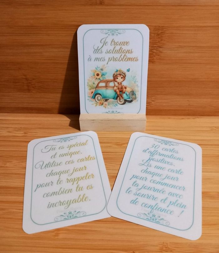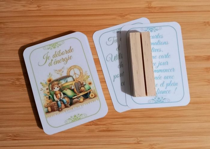 ✨" Chaque matin, choisis une carte au hasard, place-la sur le support en bois et laisse-toi imprégner par la magie des chats et la force des affirmations positives. Ce lot est plus qu'un simple jeu, c'est un outil puissant pour cultiver la confiance en soi, l'optimisme et la joie ".✨